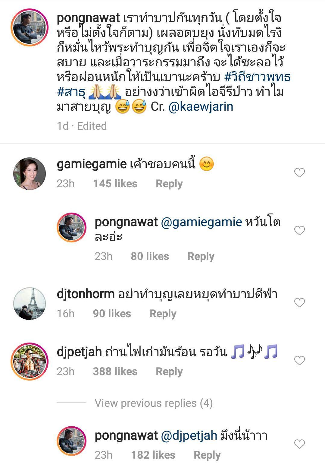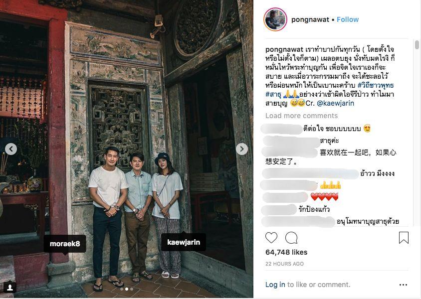 โดย ป้อง ได้โพสต์ภาพไปร่วมทำบุญกับแก้วและเขียนข้อความไว้ว่า “เราทำบาปกันทุกวัน (โดยตั้งใจหรือไม่ตั้งใจก็ตาม) เผลอตบยุง นั่งทับมดไรงิ ก็หมั่นไหว้พระทำบุญกัน เพื่อจิตใจเราเองก็จะสบาย และเมื่อวาระกรรมมาถึง จะได้ชะลอไว้ หรือผ่อนหนักให้เป็นเบานะคร้าบ #วิถีชาวพุทธ#สาธุ อย่างงว่าเข้าผิดไอจีรึป่าว ทำไมมาสายบุญ Cr. @kaewjarin”