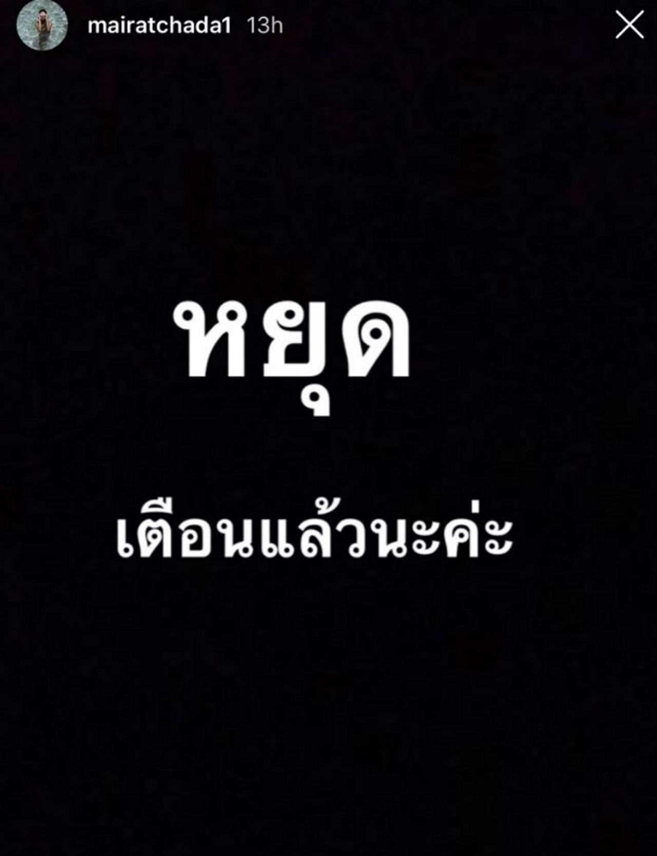 นอกจากนี้ ใหม่ รัชดา ยังได้โพสต์ภาพข้อความ "หยุด เตือนแล้วนะคะ" และภาพชูเท้าลงในไอจีสตอรี่ด้วยพร้อมบอก "กู้ดไนต์" ก็ไม่รู้ว่าจะเกี่ยวข้องกับประเด็นร้อนที่มีอยู่ในเวลานี้รึเปล่า