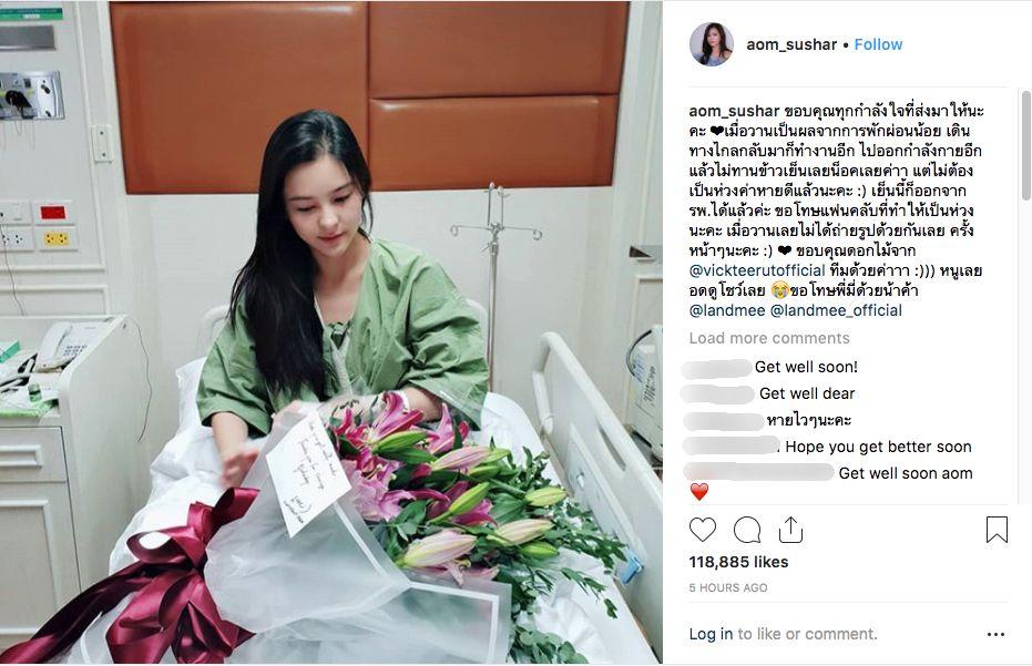ซึ่งหลังจากเกิดเหตุการณ์ดังกล่าว ออม ได้โพสต์ภาพตัวเองขณะอยู่ใน รพ. พร้อมทั้งอธิบายถึงเหตุการณ์ที่เกิดขึ้นว่า “ขอบคุณทุกกำลังใจที่ส่งมาให้นะคะ เมื่อวานเป็นผลจากการพักผ่อนน้อย เดินทางไกลกลับมาก็ทำงานอีก ไปออกกำลังกายอีก แล้วไม่ทานข้าวเย็นเลยน็อคเลยค่าา แต่ไม่ต้องเป็นห่วงค่าหายดีแล้วนะคะ :) เย็นนี้ก็ออกจาก รพ.ได้แล้วค่ะ