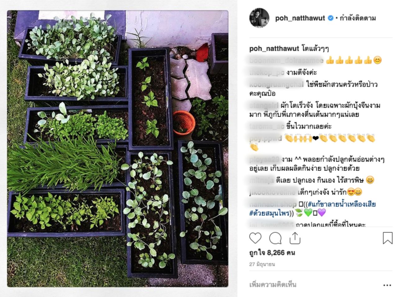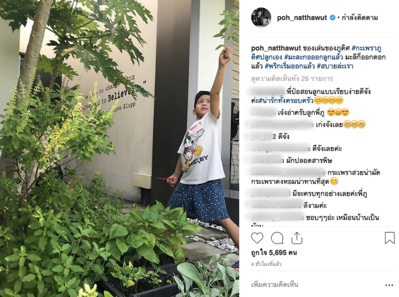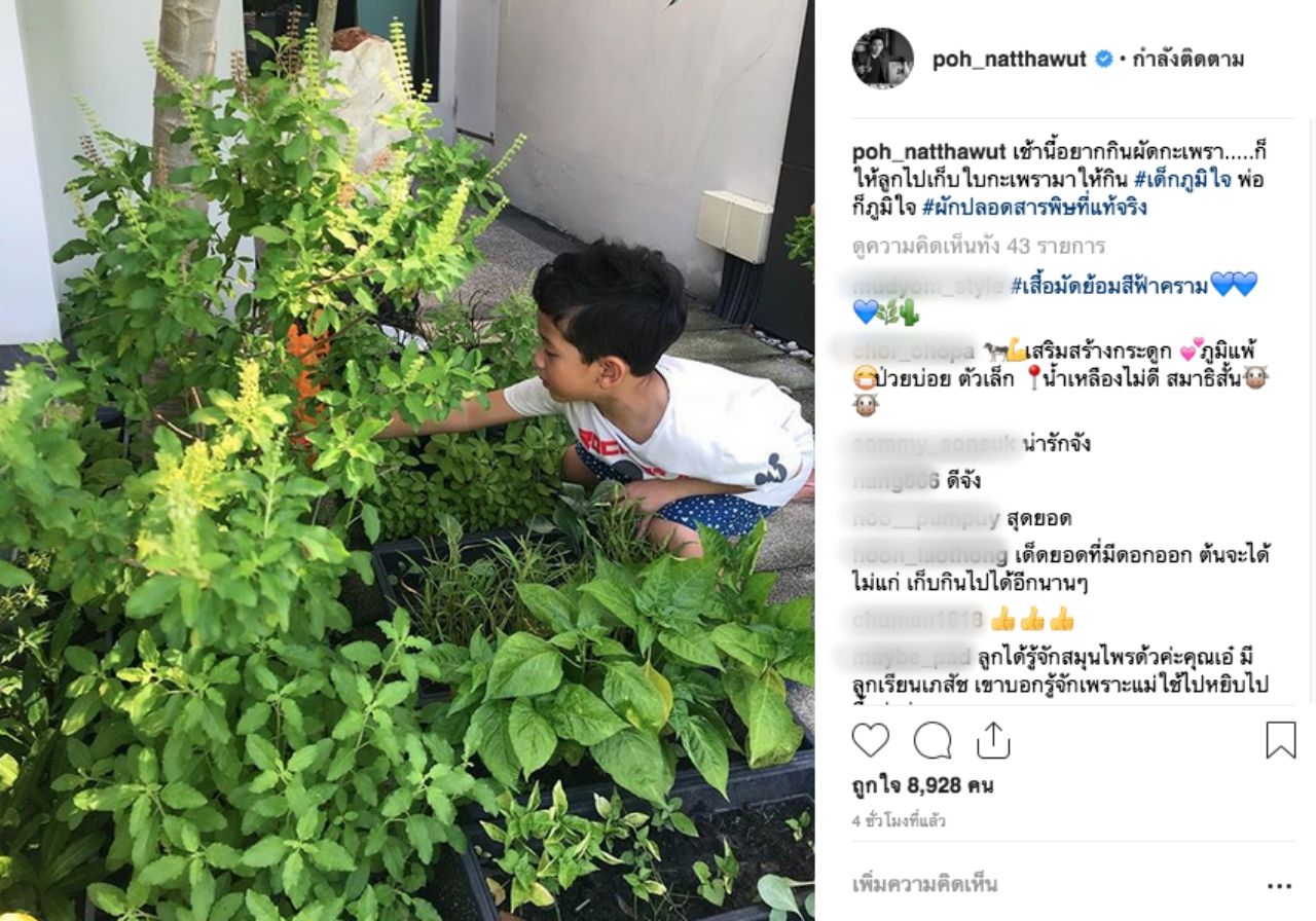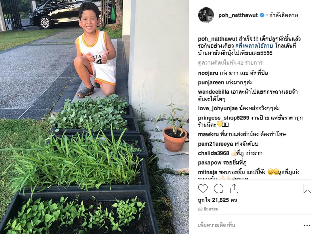 และหลังจากที่พาลูกๆ ปลูกผักใส่กระถาง และลูกชายก็เฝ้ารดน้ำพรวนดิน จนตอนนี้ผักสวนครัวปลอดสารพิษฝีมือของพ่อลูกก็เริ่มเติบโตและสามารถเก็บกินได้แล้ว ทำเอาคุณพ่อป๋อถึงกับภูมิใจในตัวลูกๆ ไม่น้อยกับความพยายามและความเอาใจใส่ ถึงกับต้องหยิบกล้องมาเก็บภาพผลงานที่เติบจากฝีมือของลูกๆ เอามาอวดให้แฟนๆ ได้เห็นกัน