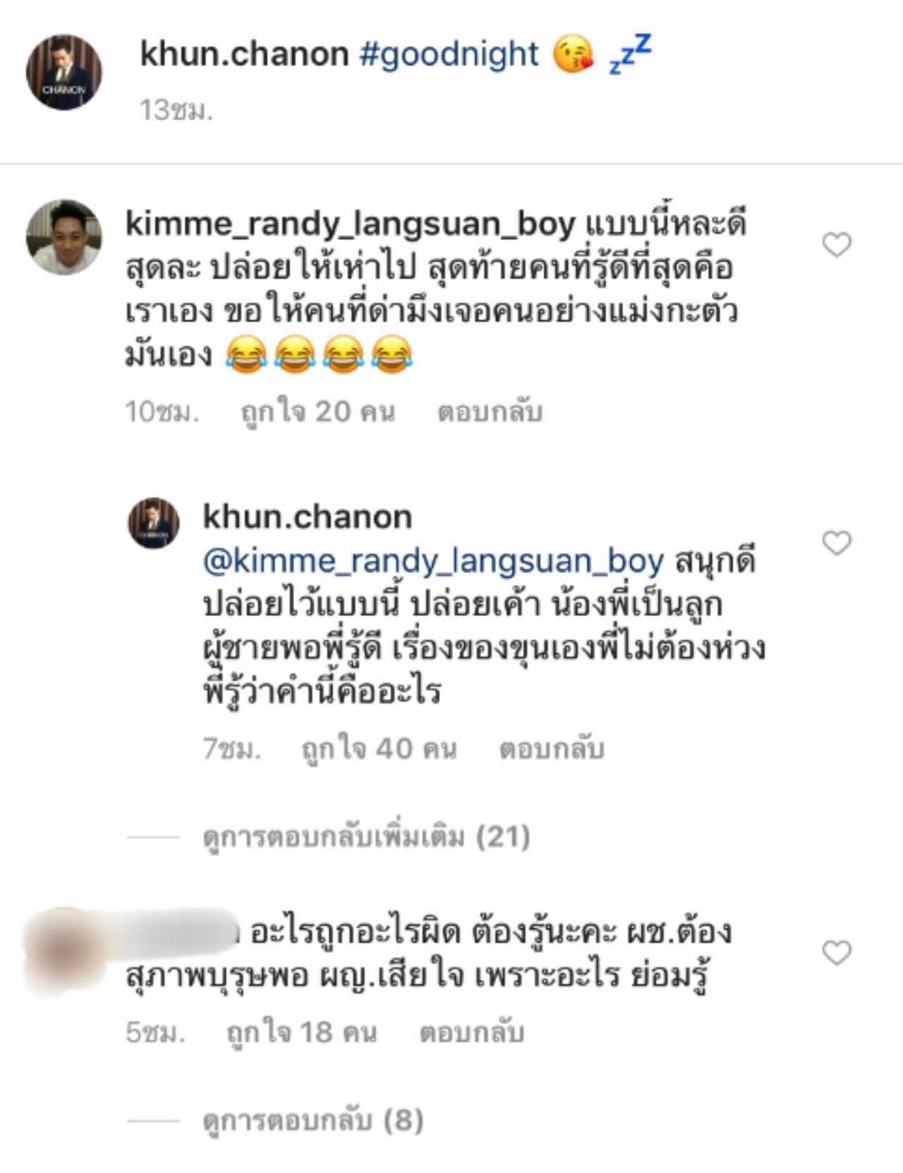 ส่วนทางด้านตัว ขุน เอง ก็ได้มีคนเข้าไปให้กำลังใจกันเป็นจำนวนมาก รวมถึงตัว เชฟแรนดี้ ชัยชัช นพประภา เชฟคนดัง ก็ได้เข้าไปให้กำลังใจ ขุน ด้วย และบอกว่า เรื่องแบบนี้ปล่อยให้เขาเห่าไป เพราะสุดท้ายคนที่รู้ดีที่สุดคือตัวเราเอง และถ้ามีใครด่าก็ขอให้เจอแบบนี้กับตัวเอง ซึ่งขุนก็เข้ามาตอบกลับว่า "สนุกดี ปล่อยไว้แบบนี้ ปล่อยเขา น้องพี่เป็นลูกผู้ชายพอพี่รู้ดี เรื่องของขุนเองพี่ไม่ต้องห่วง พี่รู้ว่าคำนี้คืออะไร".
