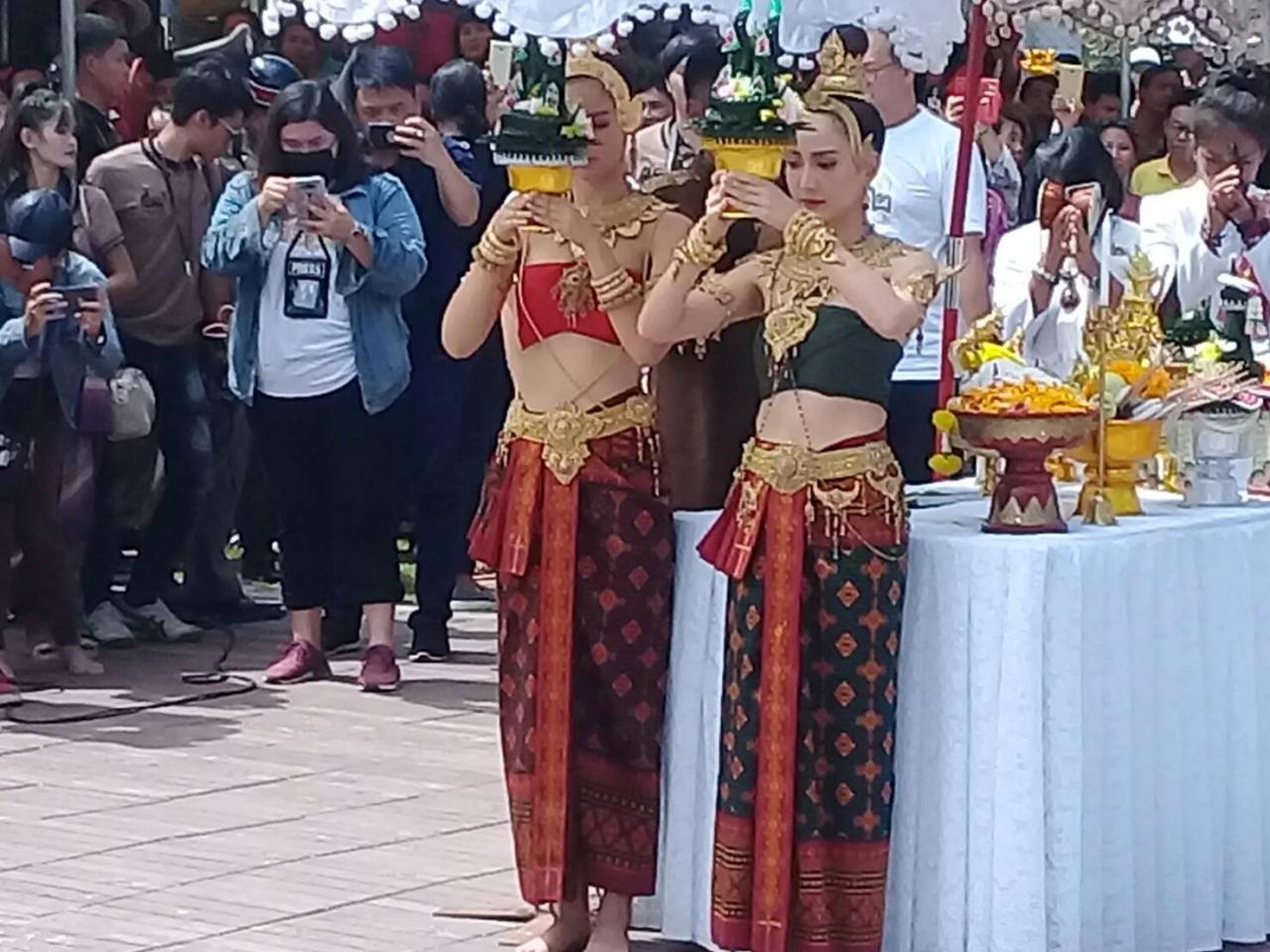 เมื่อถึงเวลาทำพิธีบวงสรวงโดยมี ประธานจุดเทียนขัย คือ คุณประวิทย์ มาลีนนท์ ประธานจุดธูปฟ้าดินคือ คุณวิฑูรย์ ลีรัตนขจร ซึ่งนางเอกสาว ญาญ่า อุรัสยา และแต้ว ณฐพร เป็นผู้รำบวงสรวงพ่อปู่ศรีสุทโธและเจ้าย่าศรีปทุมมา โดยมีแฟนคลับแห่ให้กำลังใจอย่างล้นหลาม ท่ามกลางแสงแดดร้อนแรง มีพ่อครูกล้า โพธิกัลยา เป็นเจ้าพิธี