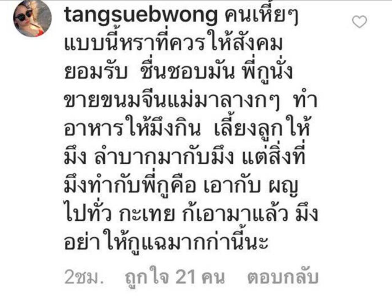 และงานนี้ก็มีหญิงสาวรายหนึ่ง ใช้ชื่ออินสตาแกรมว่า tangsuebwong อ้างว่าตนเองเป็นน้องสาวของภรรยาตลกคนดัง พร้อมกับแฉถึงพฤติกรรมสุดทนของพี่เขยแบบไม่มีเหลือ ว่าพี่สาวของตนทั้งดีและลำบากมาด้วยกัน ก็ยังทำกับพี่สาวของตนได้