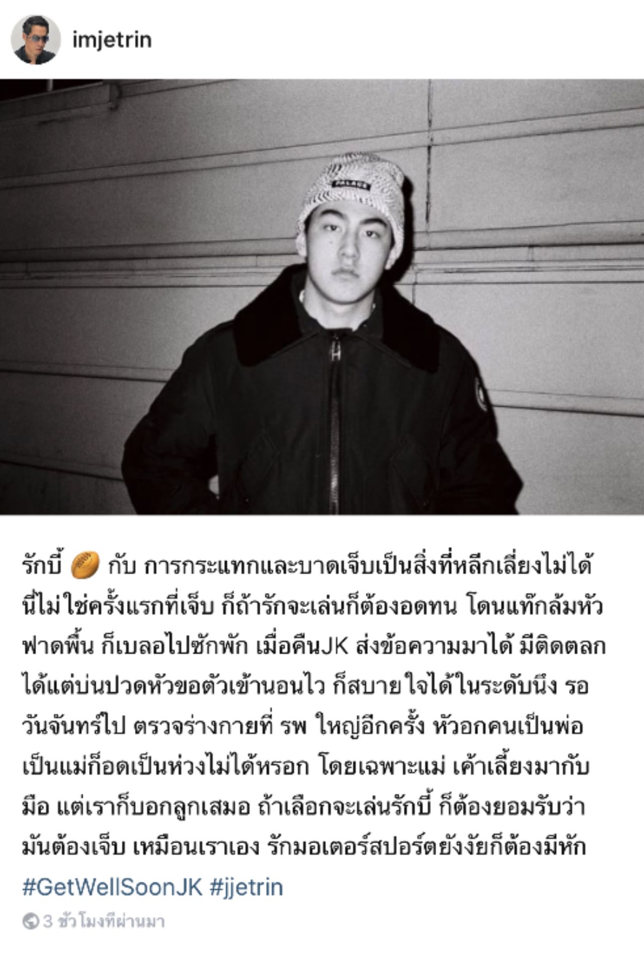 "รอวันจันทร์ไปตรวจร่างกายที่โรงพยาบาลใหญ่อีกครั้ง หัวอกคนเป็นพ่อเป็นแม่ ก็อดเป็นห่วงไม่ได้หรอก โดยเฉพาะแม่ เค้าเลี้ยงมากับมือ แต่เราก็บอกลูกเสมอ ถ้าเลือกจะเล่นรักบี้ ก็ต้องยอมรับว่ามันต้องเจ็บ เหมือนเราเองรักมอเตอร์สปอร์ต ยังไงก็ต้องมีหัก #GetWellSoonJK #jjetrin" หลังจากเจโพสต์ไปแล้ว มีแฟนคลับต่างมาให้กำลังใจกันแน่น.