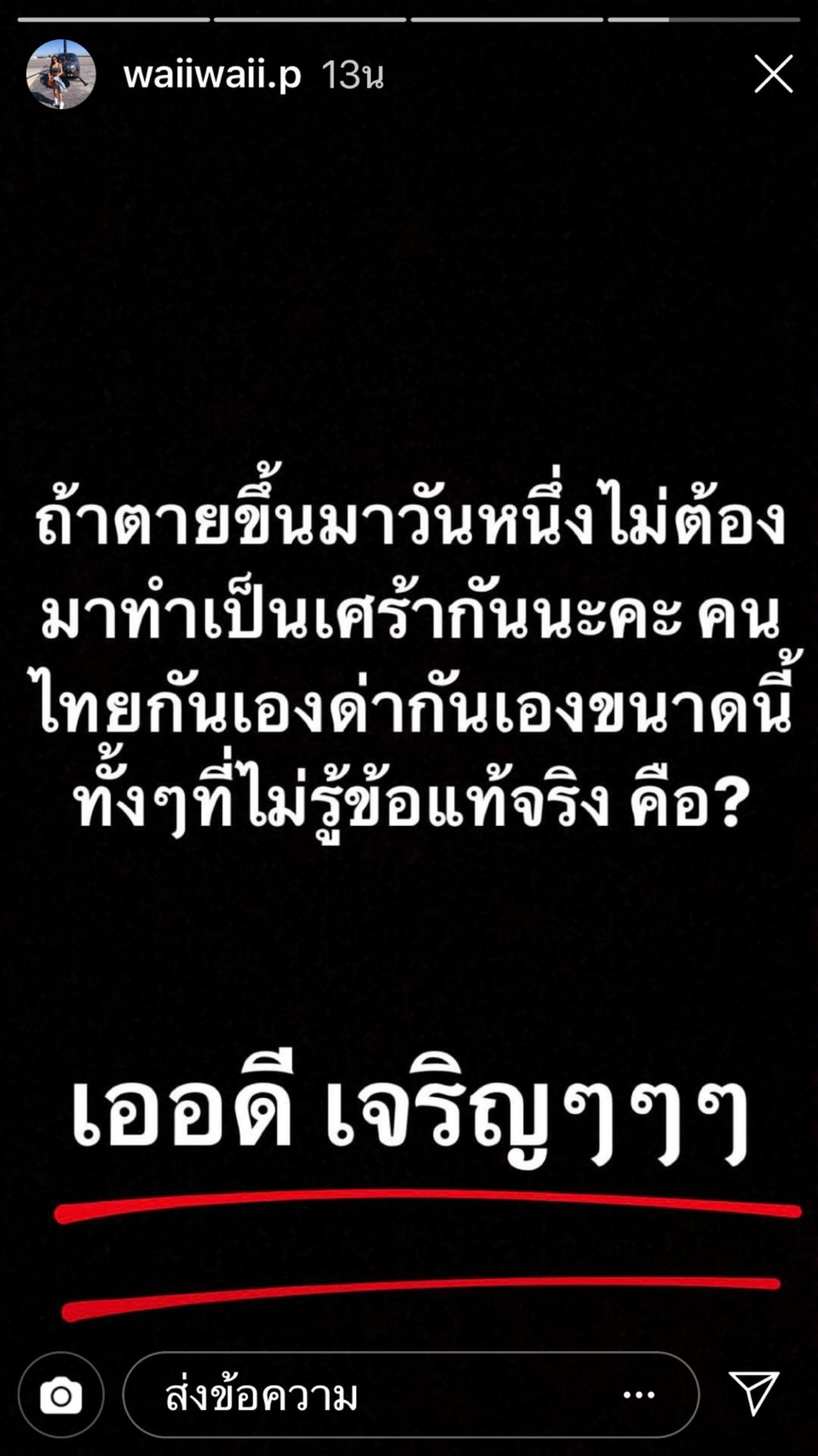 และอีกข้อความว่า “ถ้าตายขึ้นมาวันหนึ่งไม่ต้องมาทำเป็นเศร้ากันนะคะ คนไทยกันเองด่ากันเองขนาดนี้ ทั้งๆ ที่ไม่รู้ข้อเท็จจริงคือ? เออดี เจริญๆๆๆ”
