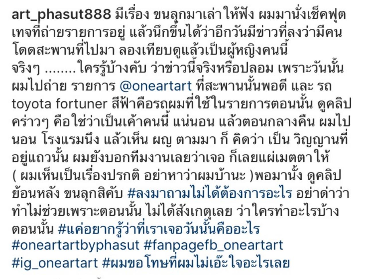"มีเรื่องขนลุกมาเล่าให้ฟัง ผมมานั่งเช็กฟุตเทจที่ถ่ายรายการอยู่ แล้วนึกขึ้นได้ว่าอีกวันมีข่าวที่ลงว่ามีคนโดดสะพานที่ไปมา ลองเทียบดูแล้วเป็นผู้หญิงคนนี้จริงๆ