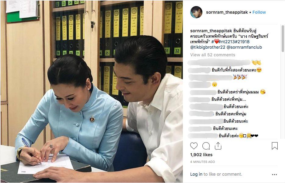 โดย หนุ่ม ได้โพสต์ภาพตัวเองและติ๊กกำลังเซ็นเอกสาร พร้อมด้วยข้อความว่า “ยินดีต้อนรับสู่ครอบครัวเทพพิทักษ์นะครับ “นางกนิษฐรินทร์ เทพพิทักษ์” #nt2213#21918 @tikbigbrother22 @sornramfanclub” และมีแฟนๆ เข้ามาโพสต์แสดงความยินดีและอวยพรให้รักกันไปนานๆ