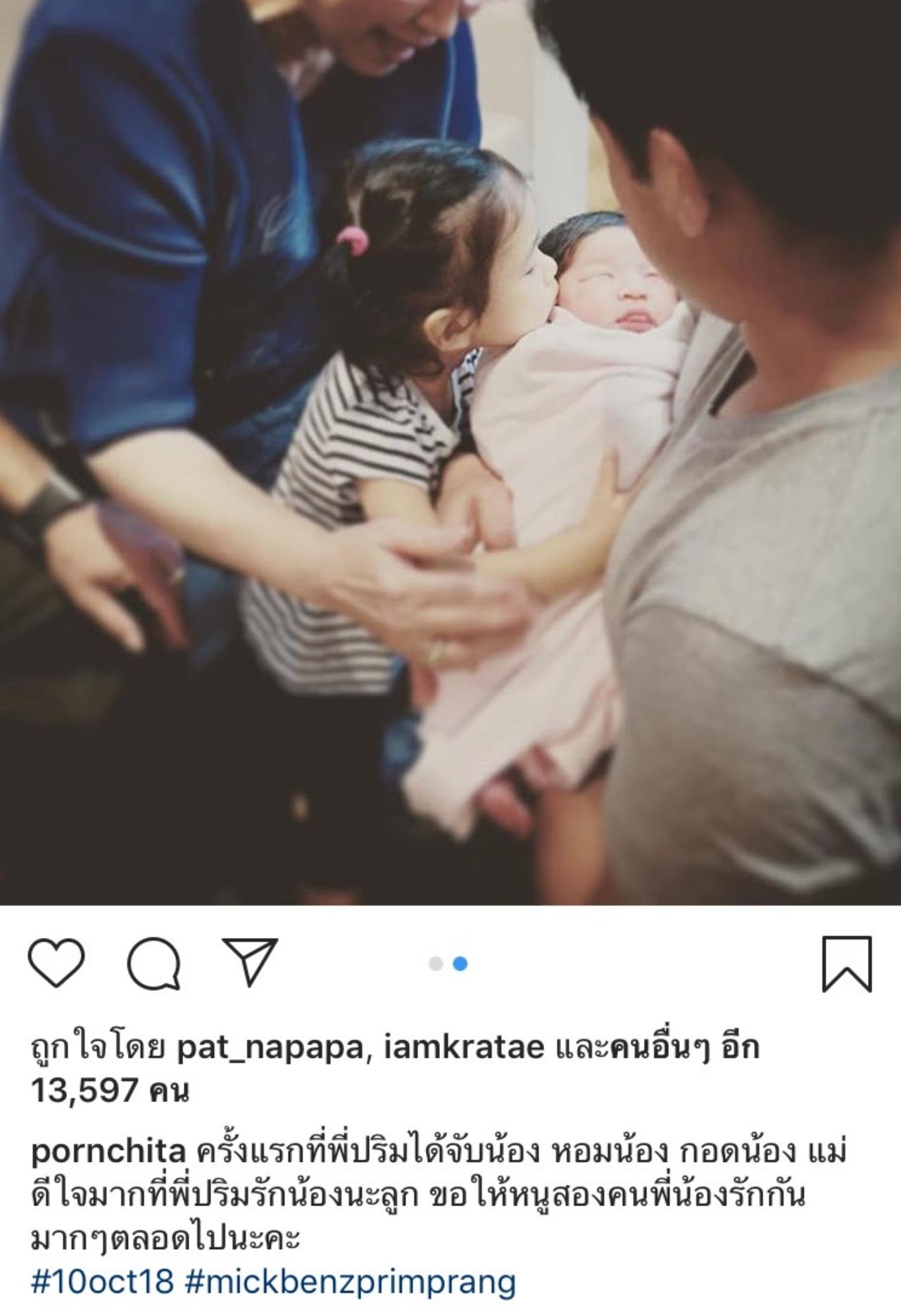 และโพสต์ภาพพี่สาวน้องปริม หอมแก้มน้องปรางด้วยความเอ็นดู พร้อมแคปชั่นน่ารักๆ ว่า “ครั้งแรกที่พี่ปริมได้จับน้อง หอมน้อง กอดน้อง แม่ดีใจมากที่พี่ปริมรักน้องนะลูก ขอให้หนูสองคนพี่น้องรักกันมากๆตลอดไป นะคะ #10oct18 #mickbenzprimprang”