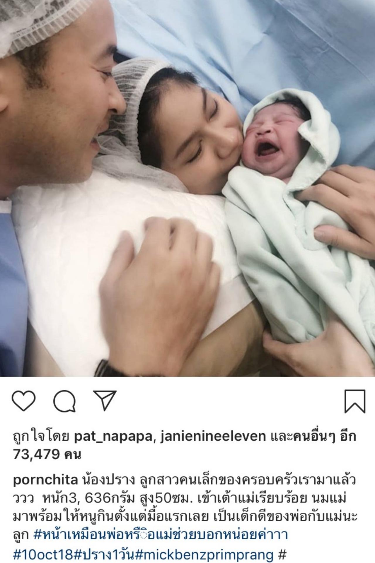 ซึ่งสาวเบนซ์ และหนุ่มมิค ได้โพสต์ภาพแรก 3 คนพ่อแม่ลูก ลงอินสตาแกรม พร้อมกับข้อความว่า “น้องปราง ลูกสาวคนเล็กของครอบครัวเรามาแล้วววว หนัก3,636กรัม สูง50ซม. เข้าเต้าแม่เรียบร้อย นมแม่มาพร้อมให้หนูกินตั้งแต่มื้อแรกเลย เป็นเด็กดีของพ่อกับแม่นะลูก #หน้าเหมือนพ่อหรือแม่ช่วยบอกหน่อยค่าาา #10oct18#ปราง1วัน#mickbenzprimprang”