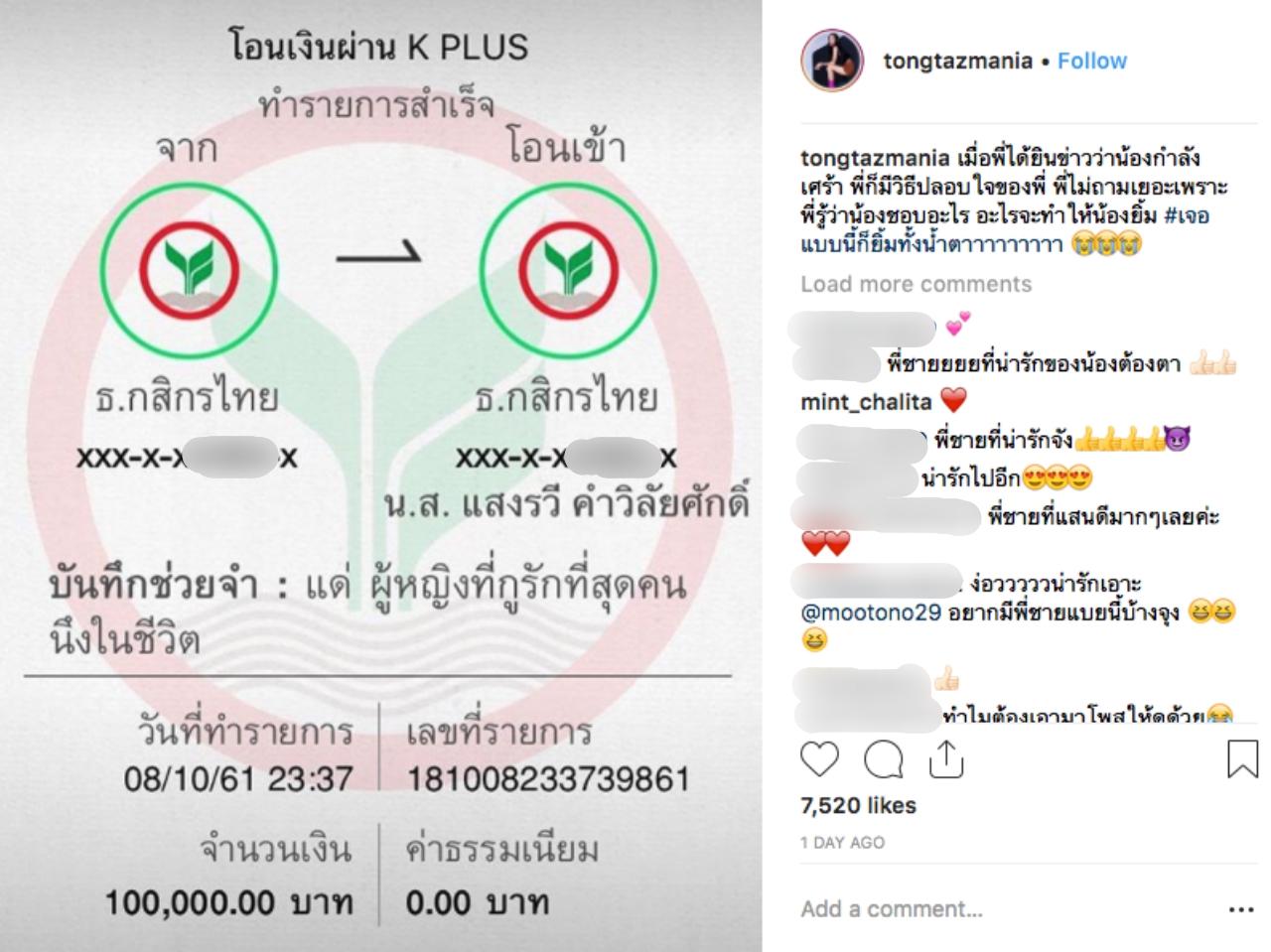 "เมื่อพี่ได้ยินข่าวว่าน้องกำลังเศร้า พี่ก็มีวิธีปลอบใจของพี่ พี่ไม่ถามเยอะเพราะพี่รู้ว่าน้องชอบอะไร อะไรจะทำให้น้องยิ้ม #เจอแบบนี้ก็ยิ้มทั้งน้ำตาาาาาาาาา" และตัว โตโน่ เอง ก็ได้เขียนโน้ตแนบมากับสลิปโอนเงินว่า "แด่ผู้หญิงที่กูรักที่สุดคนหนึ่งในชีวิต"