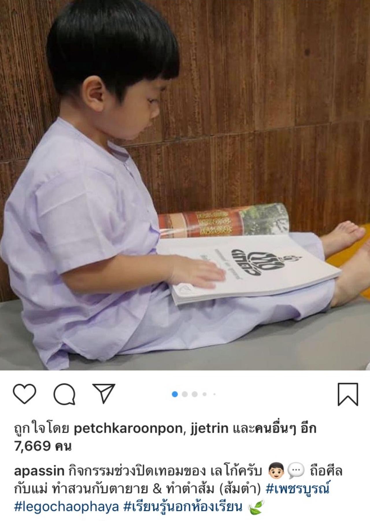 โดยหนุ่มเอได้โพสต์ภาพของน้องเลโก้ในระหว่างที่ทำกิจกรรมที่บ้านคุณตาคุณยายที่ต่างจังหวัดในอินสตาแกรมของตัวเองว่า “กิจกรรมช่วงปิดเทอมของ เลโก้ครับ ถือศีลกับแม่ ทำสวนกับตายาย & ทำตำส้ม (ส้มตำ) #เพชรบูรณ์ #legochaophaya #เรียนรู้นอกห้องเรียน”