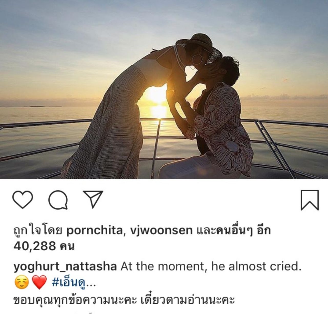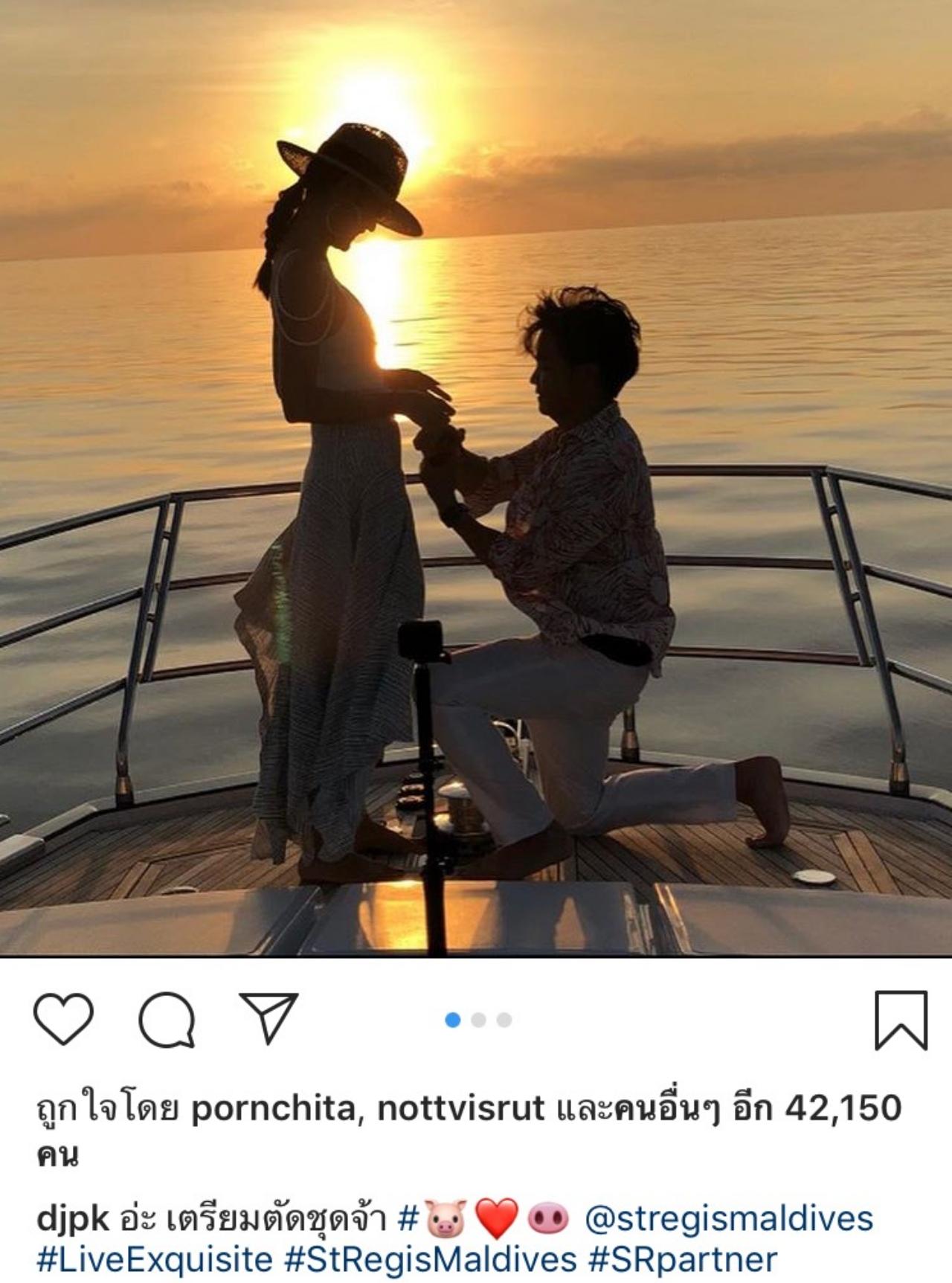 หลังจากที่โยเกิร์ตตอบเซย์เยส หนุ่มพีเค ก็ประกาศข่าวดีพร้อมกับโพสต์ภาพลงแคปชั่นว่า “อ่ะ เตรียมตัดชุดจ้า #@stregismaldives #LiveExquisite #StRegisMaldives #SRpartner” ส่วนสาวโยเกิร์ตก็โพสต์รูปและข้อความว่า “At the moment, he almost cried. #เอ็นดู...ขอบคุณทุกข้อความนะคะ เดี๋ยวตามอ่านนะคะ”