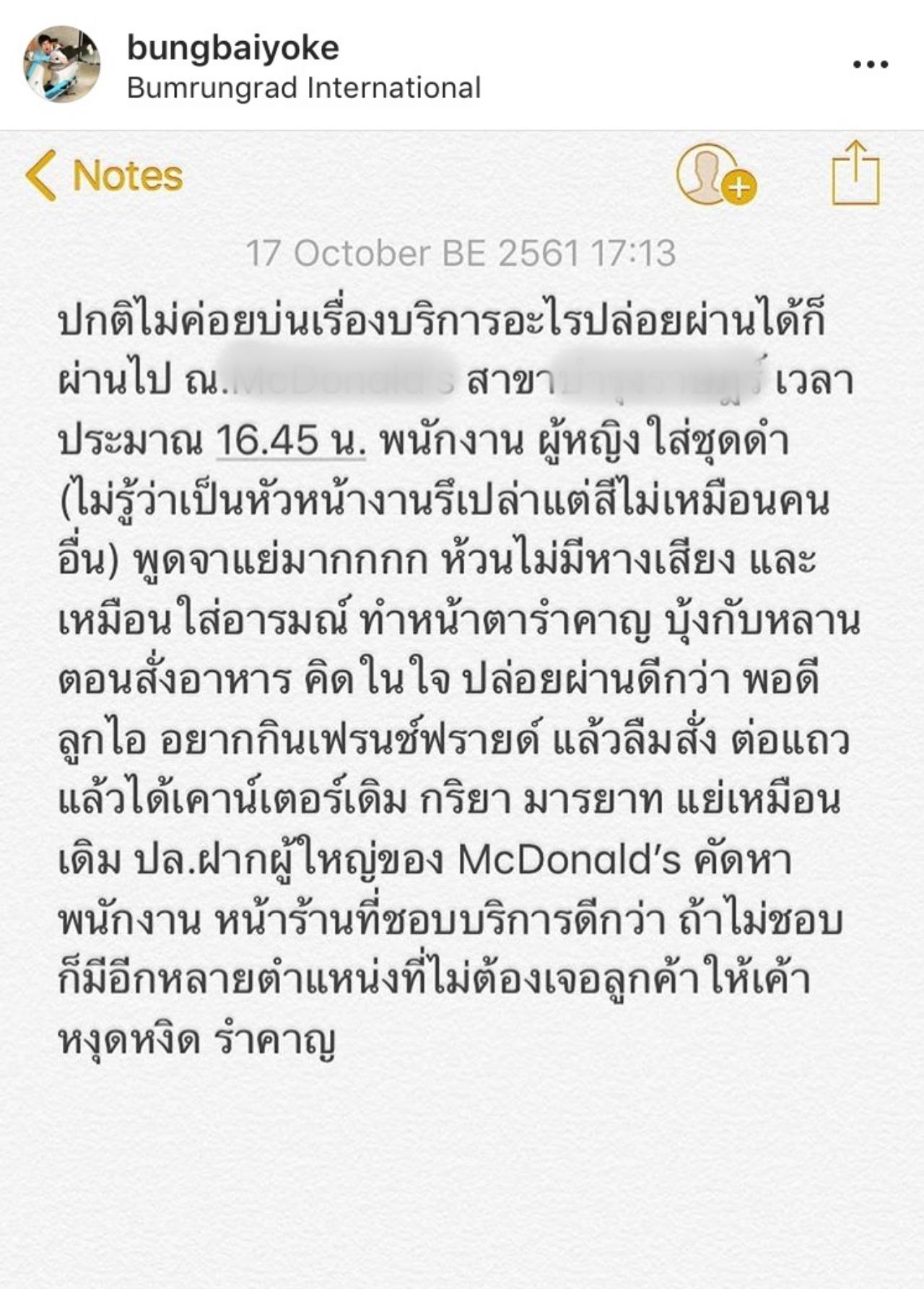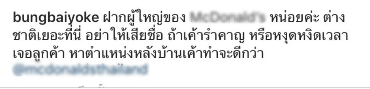 พร้อมกับแคปชั่นว่า “ฝากผู้ใหญ่ของ... หน่อยค่ะ ต่างชาติเยอะที่นี่ อย่าให้เสียชื่อ ถ้าเค้ารำคาญ หรือหงุดหงิดเวลาเจอลูกค้า หาตำแหน่งหลังบ้านเค้าทำจะดีกว่า”
