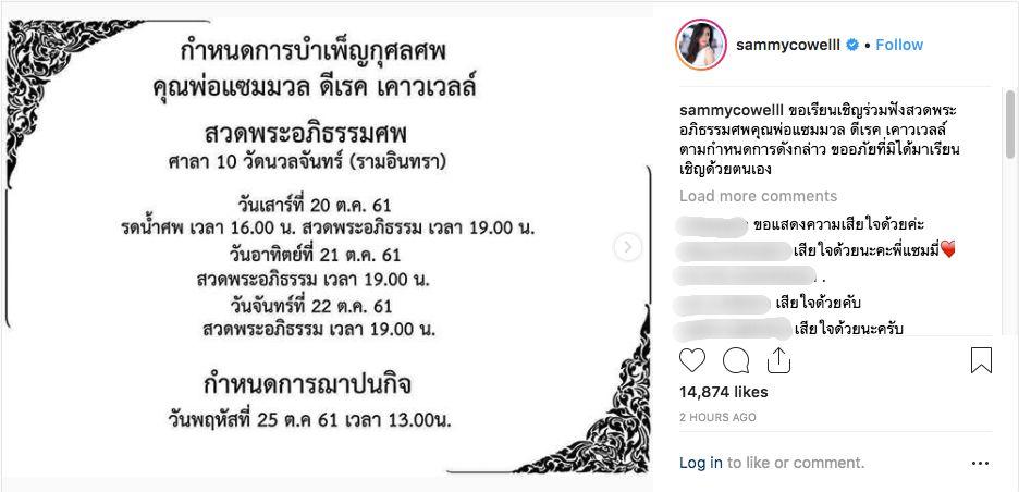 ทั้งนี้ แซมมี่ได้แจ้งกำหนดการบำเพ็ญกุศลศพของคุณพ่อว่าจะมีขึ้นที่ศาลา 10 วัดนวลจันทร์ (รามอินทรา) โดยจะมีการรดน้ำศพในวันเสาร์ที่ 20 ต.ค. 2561 เวลา 16.00 น. และสวดพระอภิธรรมศพเวลา 19.00 น. ตั้งแต่วันที่ 20-22 ต.ค. 2561 ส่วนกำหนดการฌาปนกิจจะมีขึ้นในวันพฤหัสบดีที่ 25 ต.ค. 2561 เวลา 13.00 น.