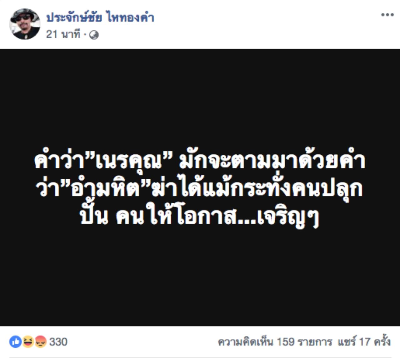 และล่าสุด เจ้าของค่ายไหทองคำ เรคคอร์ด ประจักษ์ชัย ก็ได้โพสต์ข้อความบนเฟซบุ๊กส่วนตัวด้วยข้อความที่ค่อนข้างดุเดือดเผ็ดร้อนว่า “คำว่า “เนรคุณ” มักจะตามมาด้วยคำว่า “อำมหิต” ฆ่าได้แม้กระทั่งคนปลุกปั้น คนให้โอกาส...เจริญๆ”