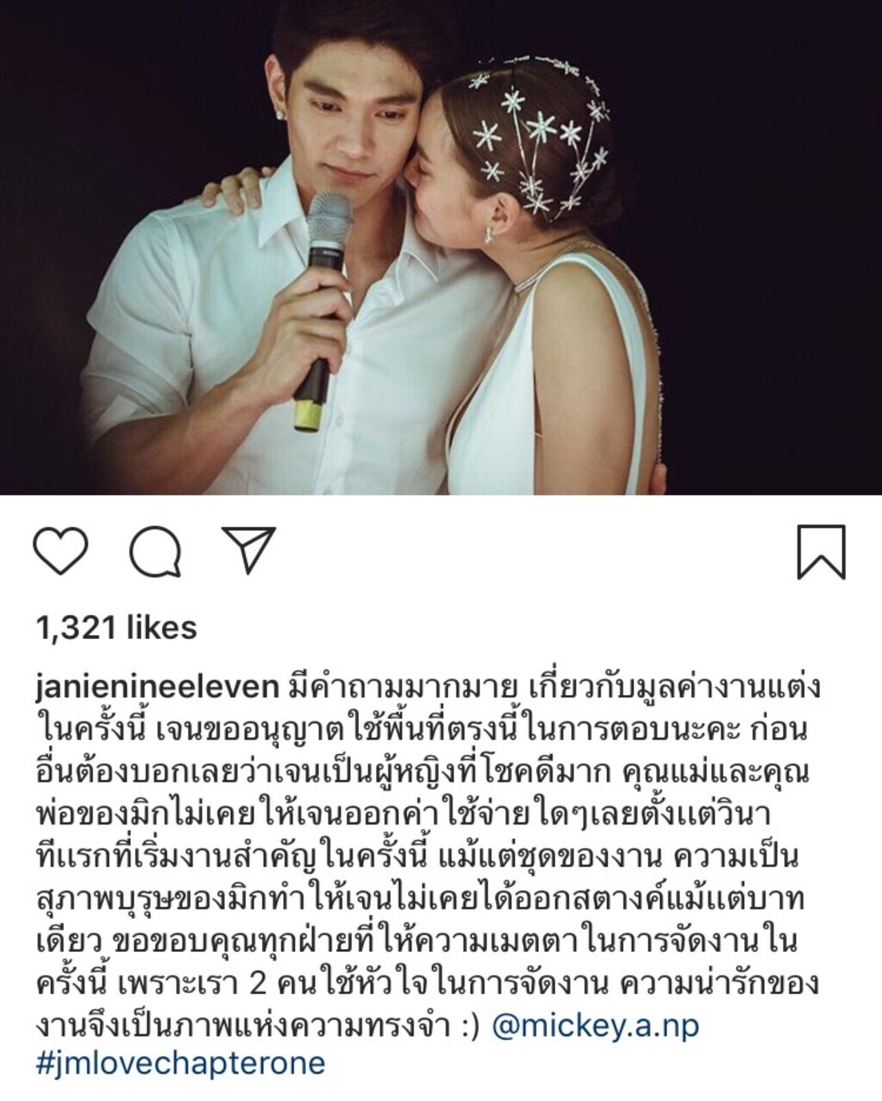 "มีคำถามมากมาย เกี่ยวกับมูลค่างานแต่งในครั้งนี้ เจนขออนุญาตใช้พื้นที่ตรงนี้ในการตอบนะคะ ก่อนอื่นต้องบอกเลยว่าเจนเป็นผู้หญิงที่โชคดีมาก คุณแม่และคุณพ่อของมิกไม่เคยให้เจนออกค่าใช้จ่ายใดๆ เลย ตั้งเเต่วินาทีเเรกที่เริ่มงานสำคัญในครั้งนี้ แม้แต่ชุดของงาน