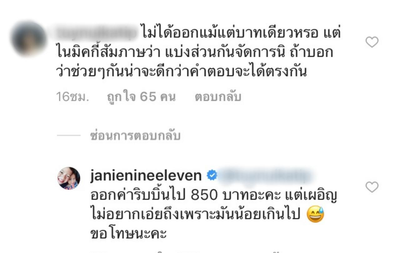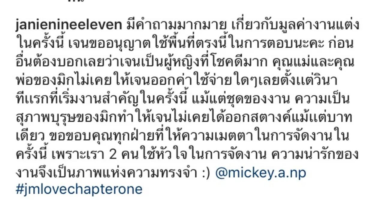 แต่หลังจากที่สาวเจนี่ชี้แจงเรื่องเงินจัดงานแต่งงานไปแล้ว ก็จะมีชาวเน็ตบางคนไม่เชื่อตามที่เจนี่พูดว่าไม่ได้ออกเงินแม้แต่บาทเดียว เพราะตอบไม่ตรงกับมิกกี้ ถ้าบอกว่าช่วยๆ กันน่าจะดีกว่า จะได้ตอบคำถามตรงกัน งานนี้ทำเอาสาวเจนี่ต้องชี้แจงให้อีกฝ่ายเข้าใจ ด้วยคำตอบที่ว่า “ออกค่าริบบิ้นไป 850 บาทอะค่ะ แต่เผอิญไม่อยากเอ่ยถึงเพราะมันน้อยเกินไป ขอโทษนะคะ”
