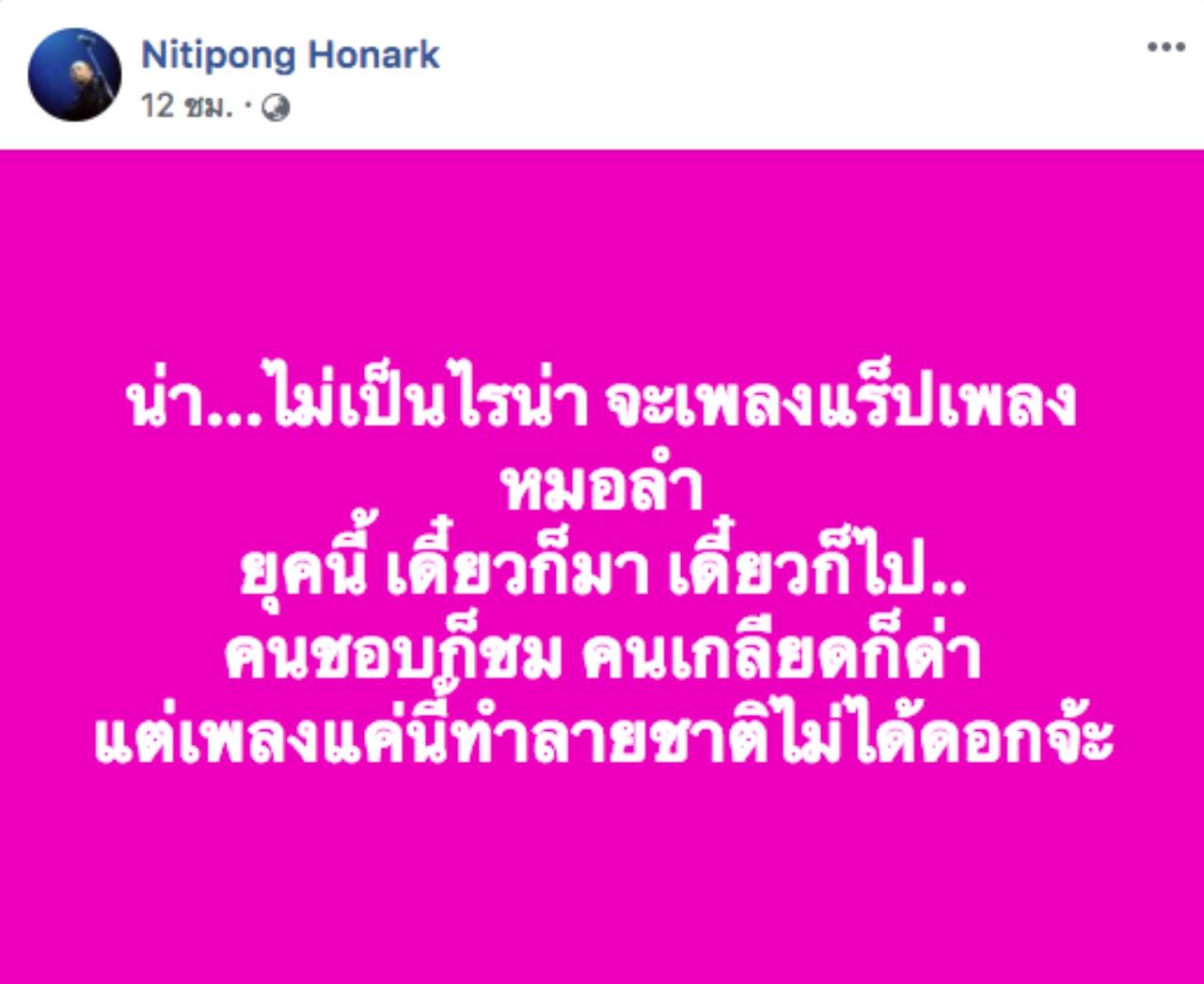โดยล่าสุด ดี้ นิติพงษ์ ห่อนาค นักแต่งเพลงชื่อดัง ได้โพสต์ถึงเรื่องนี้ผ่านเฟซบุ๊ก Nitipong Honark ว่า เพลงอะไรก็แล้วแต่ในยุคนี้ มันมาเดี๋ยวมันก็ไป คนชอบก็ชม คนเกลียดก็ด่า เพลงแค่นี้ทำลายชาติไม่ได้หรอก