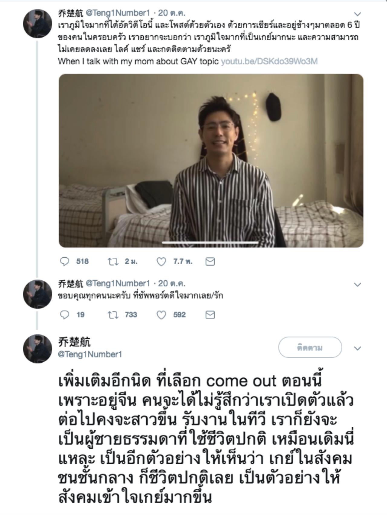 และ เต็งหนึ่ง ยังบอกอีกด้วยว่า "เพิ่มเติมอีกนิด ที่เลือก come out ตอนนี้ เพราะอยู่จีน คนจะได้ไม่รู้สึกว่าเราเปิดตัวแล้ว ต่อไปคงจะสาวขึ้น รับงานในทีวี เราก็ยังจะเป็นผู้ชายธรรมดาที่ใช้ชีวิตปกติ เหมือนเดิมนี่แหละ เป็นอีกตัวอย่างให้เห็นว่า เกย์ในสังคมชนชั้นกลาง ก็ชีวิตปกติเลย เป็นตัวอย่างให้สังคมเข้าใจเกย์มากขึ้น"