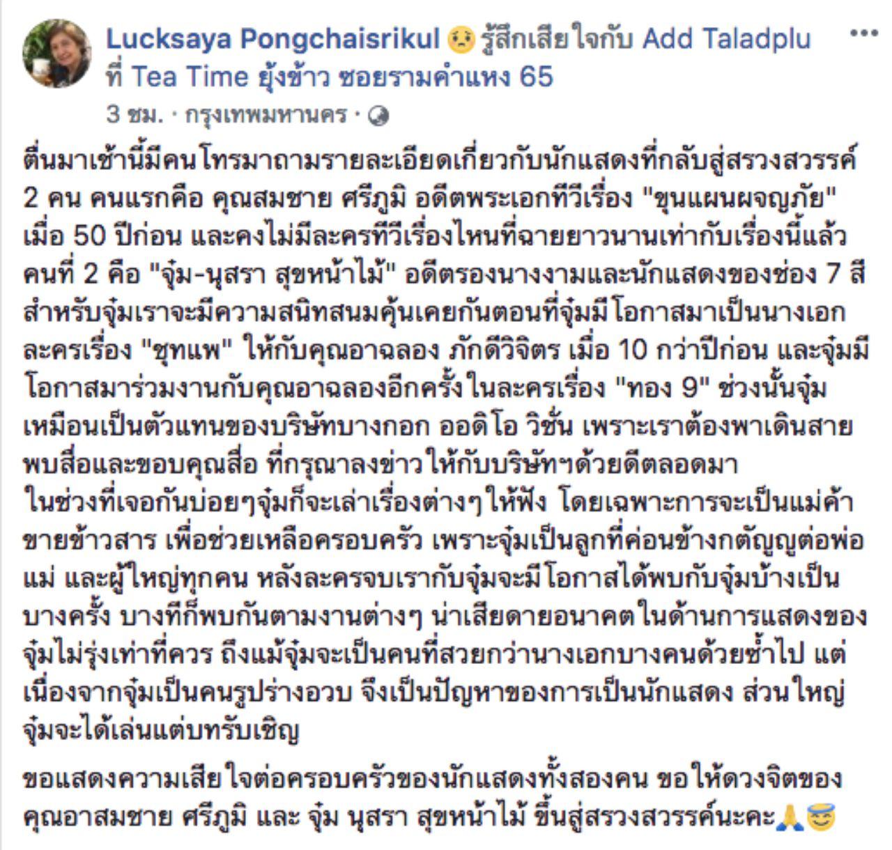 ขอแสดงความเสียใจต่อครอบครัวของนักแสดงทั้งสองคน ขอให้ดวงจิตของคุณอาสมชาย ศรีภูมิ และ จุ๋ม นุสรา สุขหน้าไม้ ขึ้นสู่สรวงสวรรค์นะคะ”.