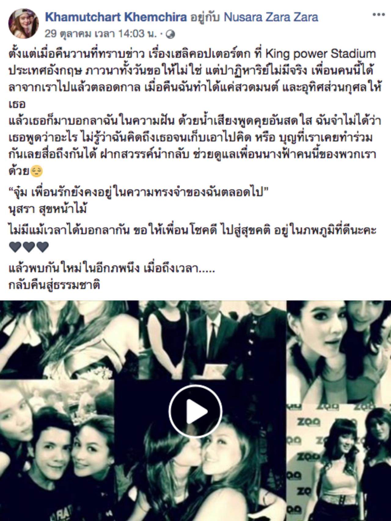 “ตั้งแต่เมื่อคืนวานที่ทราบข่าว เรื่องเฮลิคอปเตอร์ตก ที่ King power Stadium ประเทศอังกฤษ ภาวนาทั้งวันขอให้ไม่ใช่ แต่ปาฏิหาริย์ไม่มีจริง เพื่อนคนนี้ได้ลาจากเราไปแล้วตลอดกาล เมื่อคืนฉันทำได้แค่สวดมนต์ และอุทิศส่วนกุศลให้เธอ