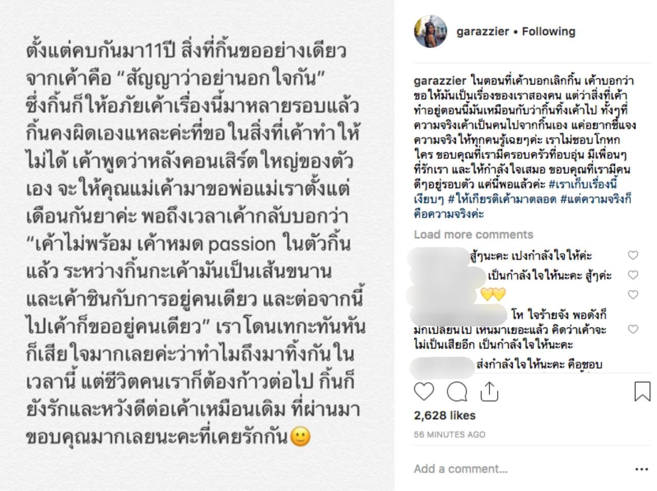 หลังจากที่โพสต์ข้อความนี้ ตัวของ กิ้น เอง ก็ได้เขียนแคปชั่นว่า "ในตอนที่เค้าบอกเลิกกิ้น เค้าบอกว่าขอให้มันเป็นเรื่องของเราสองคน แต่ว่าสิ่งที่เค้าทำอยู่ตอนนี้มันเหมือนกับว่ากิ้นทิ้งเค้าไป ทั้งๆ ที่ความจริงเค้าเป็นคนไปจากกิ้นเอง แค่อยากชี้แจงความจริงให้ทุกคนรู้เฉยๆ ค่ะ