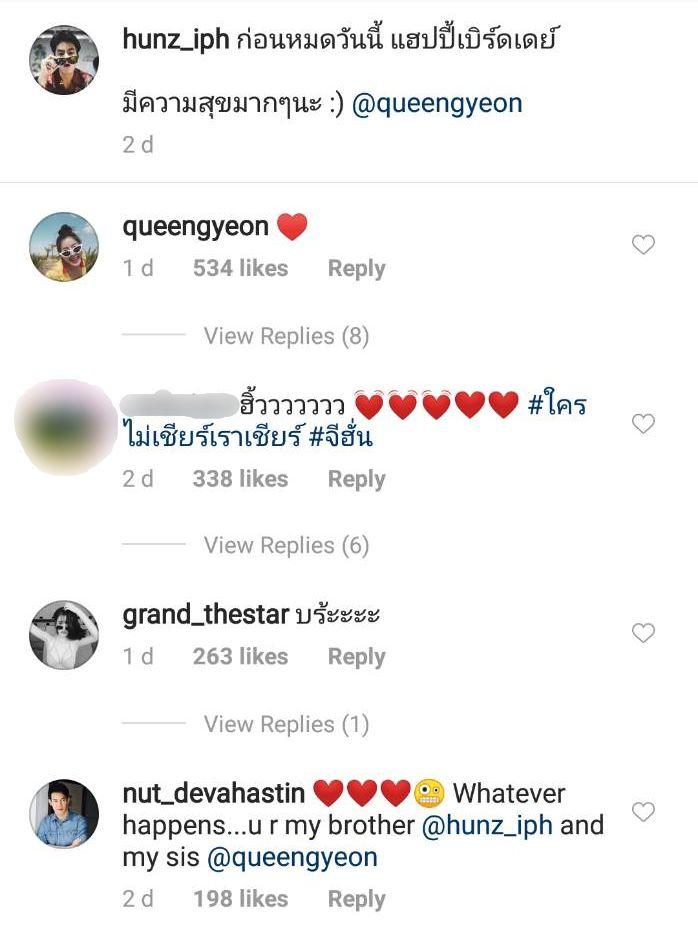 หลังจากนั้นก็มีแฟนๆ เข้ามาคอมเมนต์แซวทั้งคู่ พร้อมทั้งบอกว่าออกตัวเชียร์ด้วย รวมไปถึงเพื่อนๆ ในวงการ ทั้ง แกรนด์ เดอะสตาร์ และ ณัฏฐ์ เทพหัสดิน ณ อยุธยา ส่วนจียอนก็ได้คอมเมนต์ตอบกลับเป็นไอคอนรูปหัวใจด้วย.