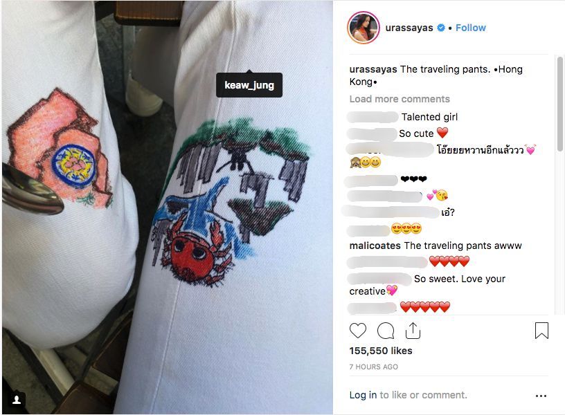 งานนี้ ญาญ่า ได้โพสต์ภาพกางเกงยีนส์เพนท์ลายน่ารักๆ คู่กัน และแท็กไปที่ไอจี @keaw_jung ซึ่งเป็นไอจีของแม่แก้ว คุณแม่ของณเดชน์ และเขียนข้อความว่า “The traveling pants. •Hong Kong•” งานนี้เลยมีแฟนๆ เข้ามาแซวความหวานของทั้งคู่จนไอจีแทบแตกอีกครั้ง บ้างก็บอกว่าขาคู่อีกแล้ว รอรูปคู่อยู่นะจ๊ะ อิอิ