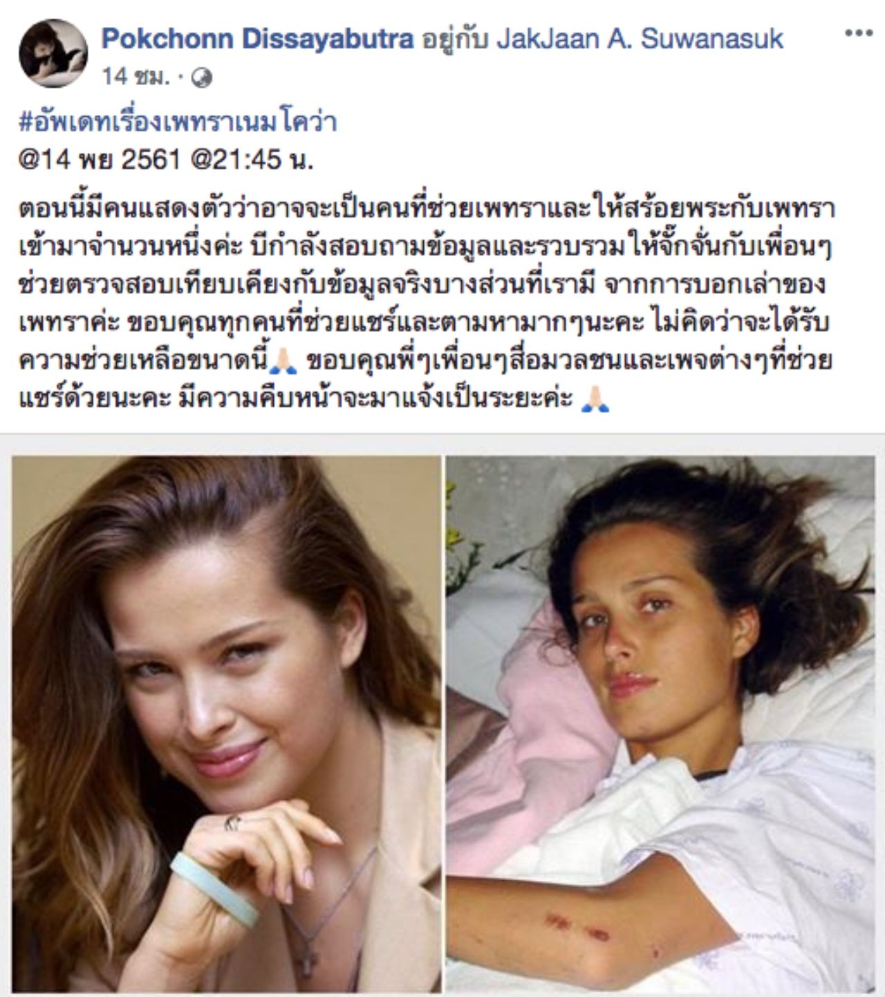 และล่าสุดผู้จัดการส่วนตัวของจั๊กจั่นก็ได้โพสต์ข้อความผ่านเฟซบุ๊กส่วนตัวที่ชื่อว่า Pokchonn Dissayabutra อัพเดตเรื่องราวของเพทราโดยมีข้อความดังนี้