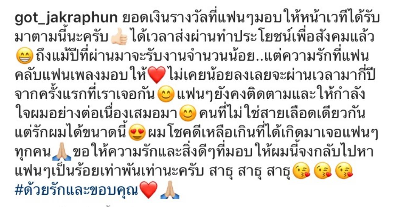 “ยอดเงินรางวัลที่แฟนๆมอบให้หน้าเวทีได้รับมาตามนี้นะครับ ได้เวลาส่งผ่านทำประโยชน์เพื่อสังคมแล้ว ถึงแม้ปีที่ผ่านมาจะรับงานจำนวนน้อย..แต่ความรักที่แฟนคลับแฟนเพลงมอบให้ ไม่เคยน้อยลงเลย จะผ่านเวลามากี่ปีจากครั้งแรกที่เราเจอกัน แฟนๆยังคงติดตามและให้กำลังใจผมอย่างต่อเนื่องเสมอมา คนที่ไม่ใช่สายเลือดเดียวกันแต่รักผมได้ขนาดนี้ ผมโชคดีเหลือเกินที่ได้เกิดมาเจอแฟนๆทุกคน ขอให้ความรักและสิ่งดีๆที่มอบให้ผมนี้จงกลับไปหาแฟนๆเป็นร้อยเท่าพันเท่านะครับ สาธุ สาธุ สาธุ #ด้วยรักและขอบคุณ”