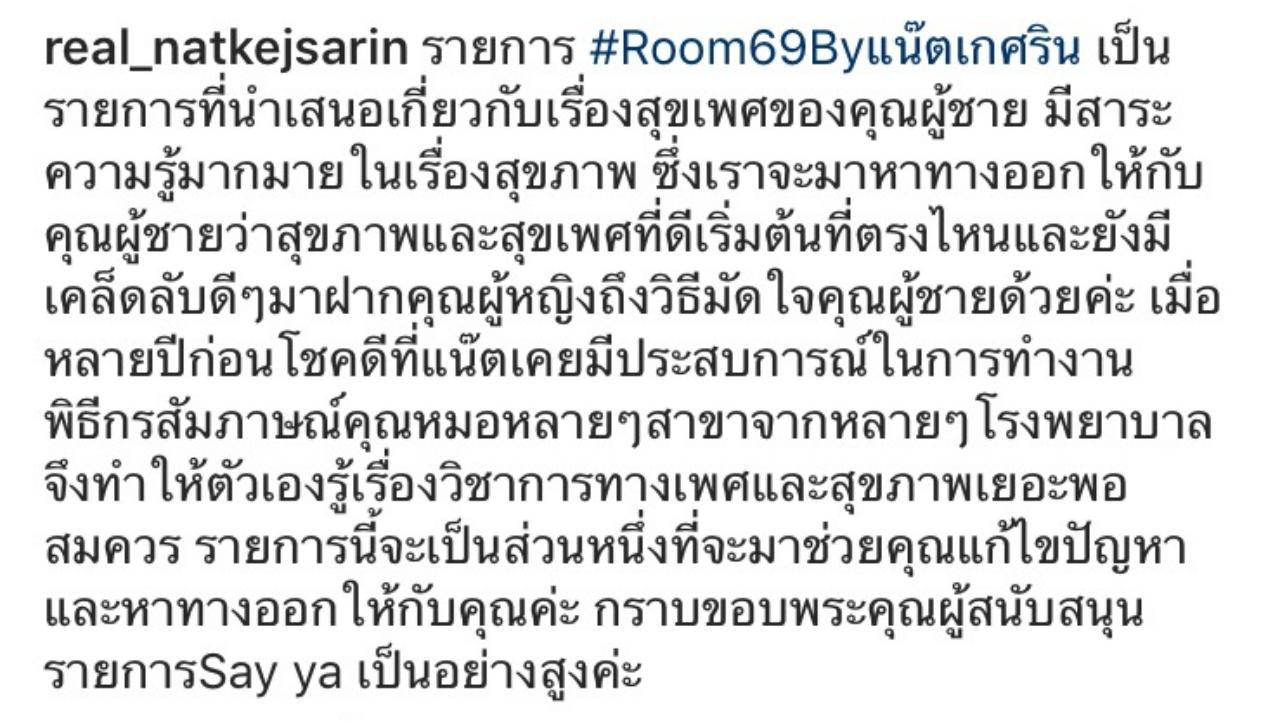 “รายการ #Room69Byแน๊ตเกศริน เป็นรายการที่นำเสนอเกี่ยวกับเรื่องสุขเพศของคุณผู้ชาย มีสาระความรู้มากมายในเรื่องสุขภาพ ซึ่งเราจะมาหาทางออกให้กับคุณผู้ชายว่าสุขภาพและสุขเพศที่ดีเริ่มต้นที่ตรงไหนและยังมีเคล็ดลับดีๆ มาฝากคุณผู้หญิงถึงวิธีมัดใจคุณผู้ชายด้วยค่ะ