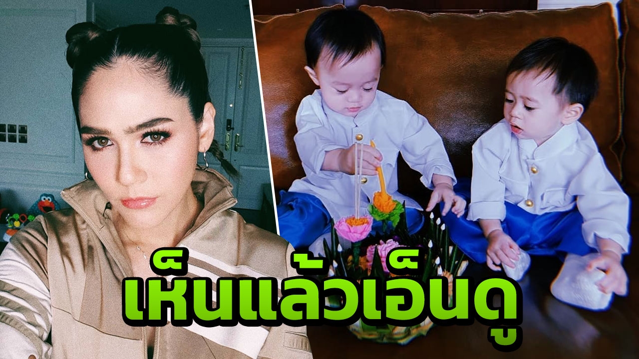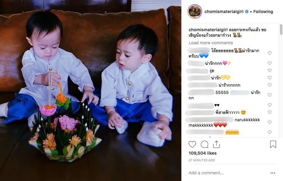 และมาถึงเทศกาลลอยกระทงทั้งทีมีหรือที่ 2 แฝดจะพลาด งานนี้คุณแม่ชมเลยให้ลูกๆ แต่งชุดไทยและเล่นกับกระทง พร้อมทั้งแชะภาพน่ารักๆ มาลงไอจีและเขียนข้อความว่า “ลอยกระทงกันเเล้ว ขอเชิญน้องแก้วออกมารำวง”