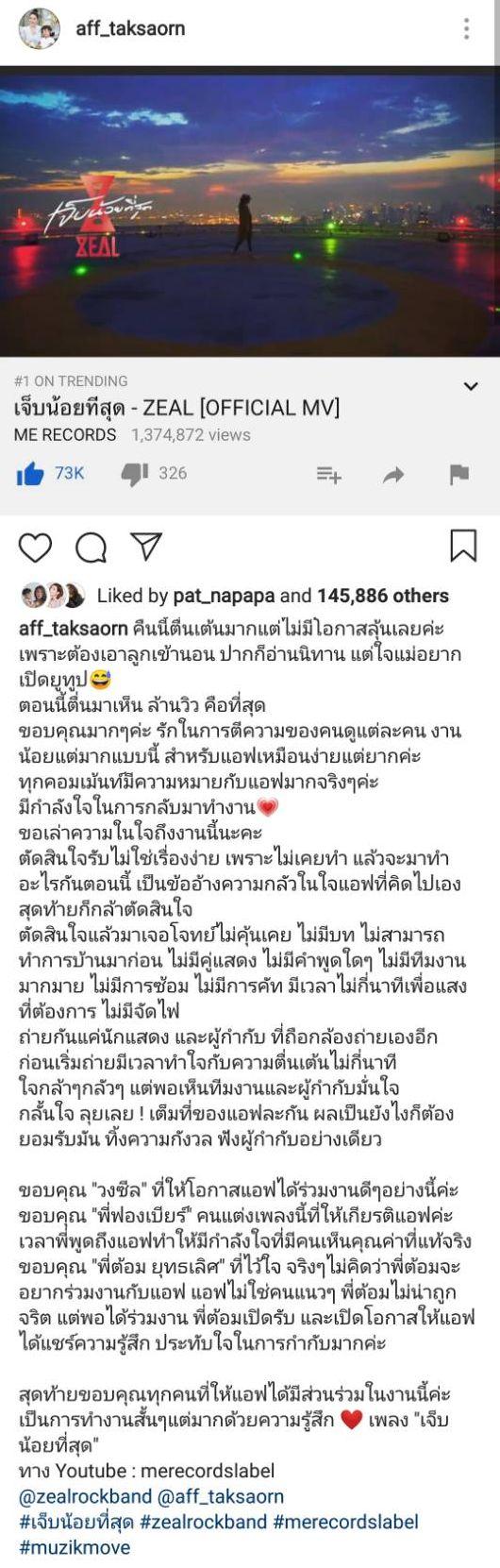 งานนี้แอฟได้โพสต์ความในใจหลังมิวสิกวิดีโอเพลงนี้ทะลุล้านวิวภายใน 6 ชม. ว่า “คืนนี้ตื่นเต้นมากแต่ไม่มีโอกาสลุ้นเลยค่ะ เพราะต้องเอาลูกเข้านอน ปากก็อ่านนิทาน แต่ใจแม่อยากเปิดยูทูบ ตอนนี้ตื่นมาเห็น ล้านวิว คือที่สุด ขอบคุณมากๆ ค่ะ รักในการตีความของคนดูแต่ละคน งานน้อยแต่มากแบบนี้ สำหรับแอฟเหมือนง่ายแต่ยากค่ะ ทุกคอมเมนต์มีความหมายกับแอฟมากจริงๆ ค่ะ มีกำลังใจในการกลับมาทำงาน