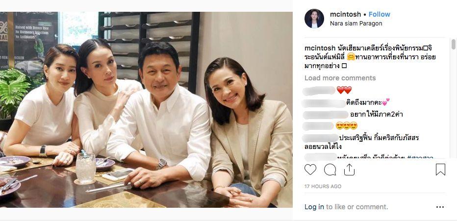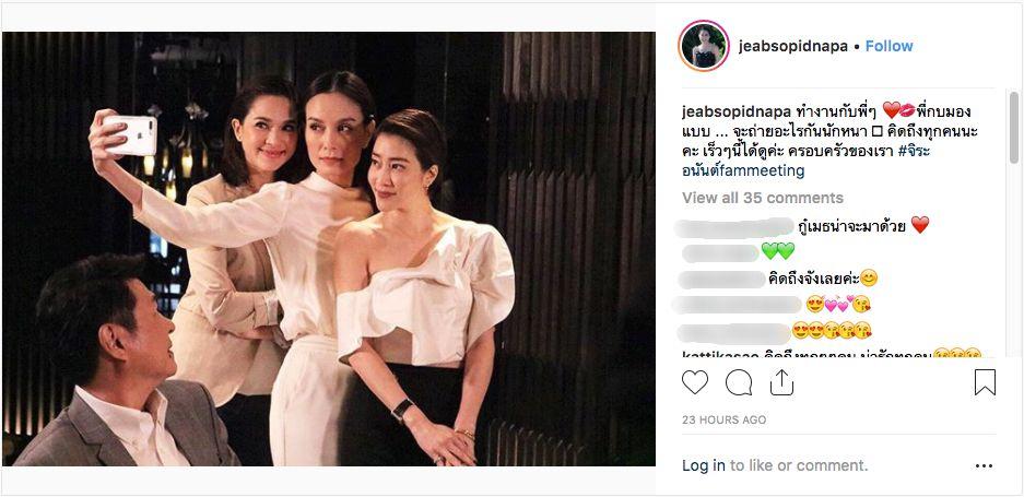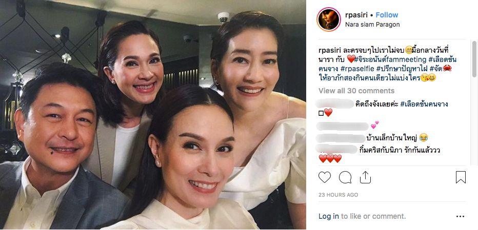 โดยแหม่มได้เขียนไว้ว่า “นัดเฮียมาเคลียร์เรื่องพินัยกรรม จิระอนันต์แฟมิลี่” ส่วนเจี๊ยบเขียนว่า “ทำงานกับพี่ๆ พี่กบมองแบบ ... จะถ่ายอะไรกันนักหนา คิดถึงทุกคนนะคะ เร็วๆนี้ได้ดูค่ะ ครอบครัวของเรา #จิระอนันต์fammeeting” ปิดท้ายที่อุ๋มเขียนว่า “ละครจบๆ ไปเราไม่จบ #จิระอนันต์fammeeting #เลือดข้นคนจาง #rpaselfie #ปรึกษาปัญหาไฝ #จัดให้อาภักสองกินคนเดียวไม่แบ่งใคร”