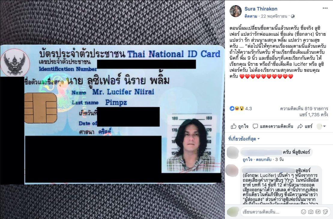 โดย นิกกี้ ได้โพสต์ภาพบัตรประชาชนตัวเองที่เปลี่ยนชื่อแล้วในเฟซบุ๊กส่วนตัวและเขียนข้อความว่า “ตอนนี้ผมเปลี่ยนชื่อตามนี้แล้วนะครับ ชื่อจริง ลูซิเฟอร์ แปลว่ารักพ่อและแม่ ชื่อเล่น (ชื่อกลาง) นิราย แปลว่า รัก ส่วนนามสกุล พลิ้ม แปลว่า ความสุขครับ ... “ต่อไปนี้ไห้ทุกคนเรื่องผมตามนี้แล้วนะครับ ถ้าไห้ความรักกันครับ ห้ามเรียกชื่อเดิมแล้วนะครับ นิคกี้ พิ้ม 9 นิ้ว และชื่ออื่นๆ ที่เคยเรียกกันครับ ไห้เรียกคุณ นิราย หรือถ้าชื่อเต็มคือ lucifer หรือ ลูซิเฟอร์ครับ ไม่ต้องเรียกนามสกุลนะครับ ขอบคุณครับ”