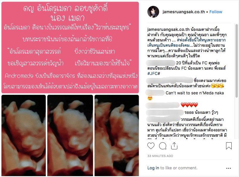 ซึ่งหนุ่มเจมส์เผยถึงเรื่องตั้งชื่อลูกสาวไว้ว่า “น้องเมดาฝากเนื้อฝากตัว กับคุณลุงคุณป้า คุณน้าคุณอา และพี่ๆ ทุกคนด้วยนะค้าา ... #พ่อตั้งชื่อนี้ให้หนูเพราะอยากเห็นหนูเป็นคนดีของสังคม...ไม่ว่าจะอยู่ในสถานการณ์ใดๆ...ความดีจะเป็นแสงสว่างนำพาลูกให้พานพบแต่เรื่องดีๆ คนดีๆ ในชีวิต”