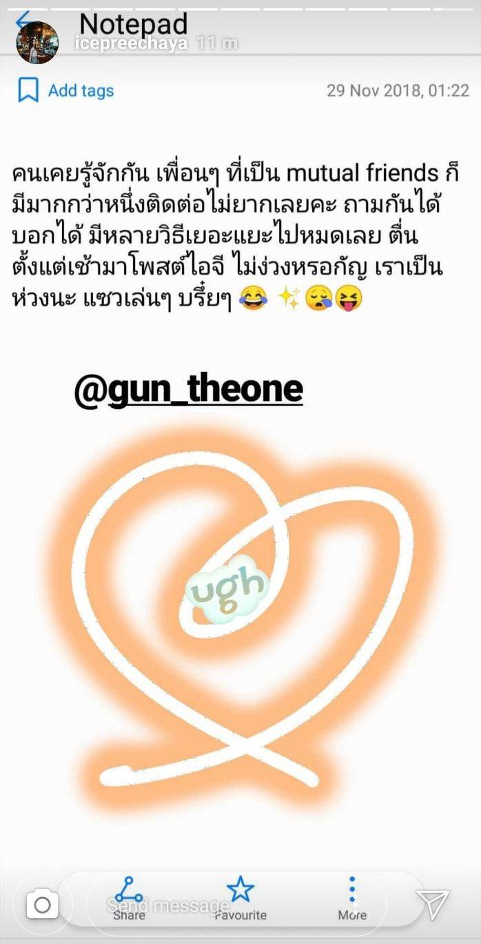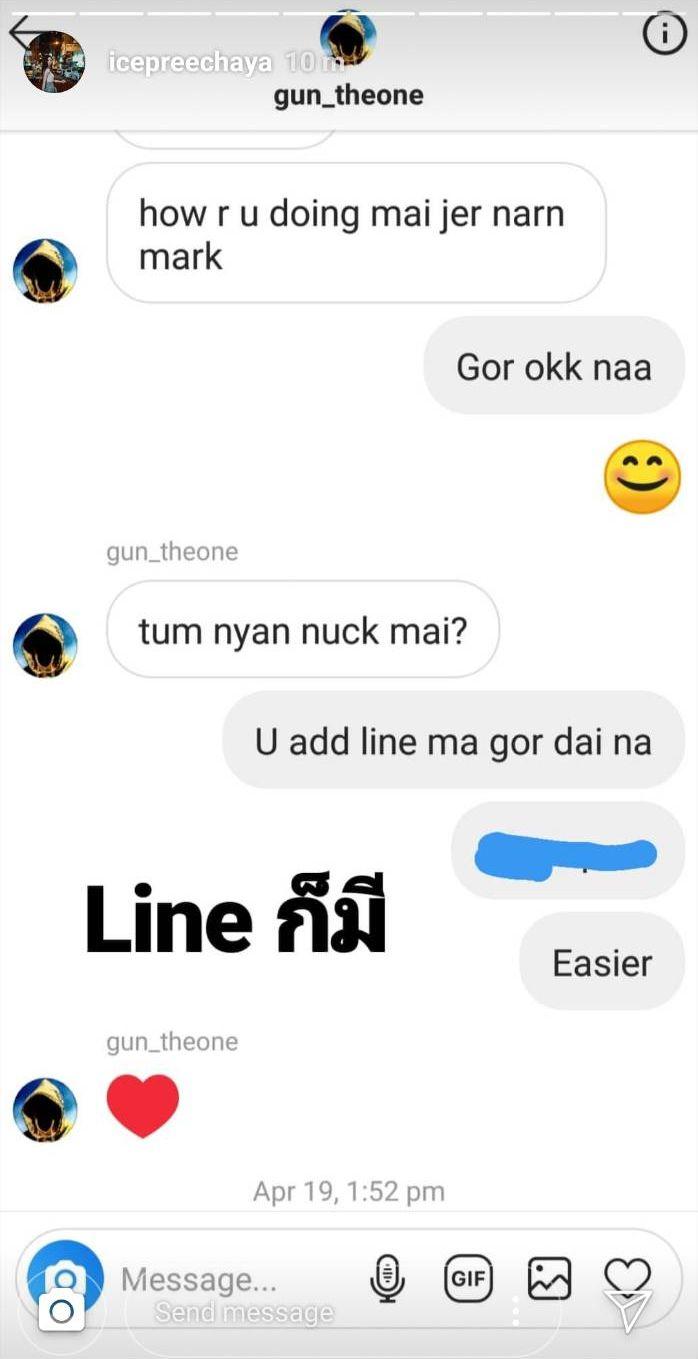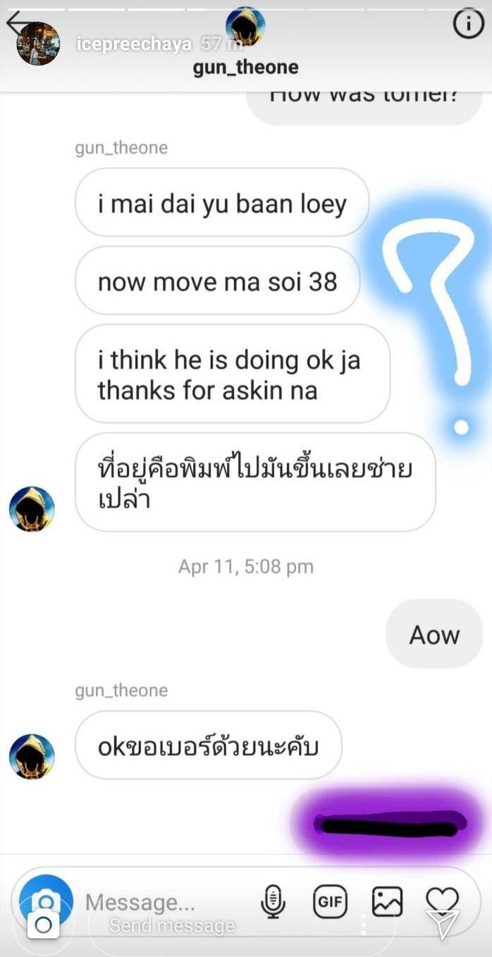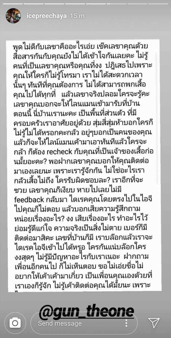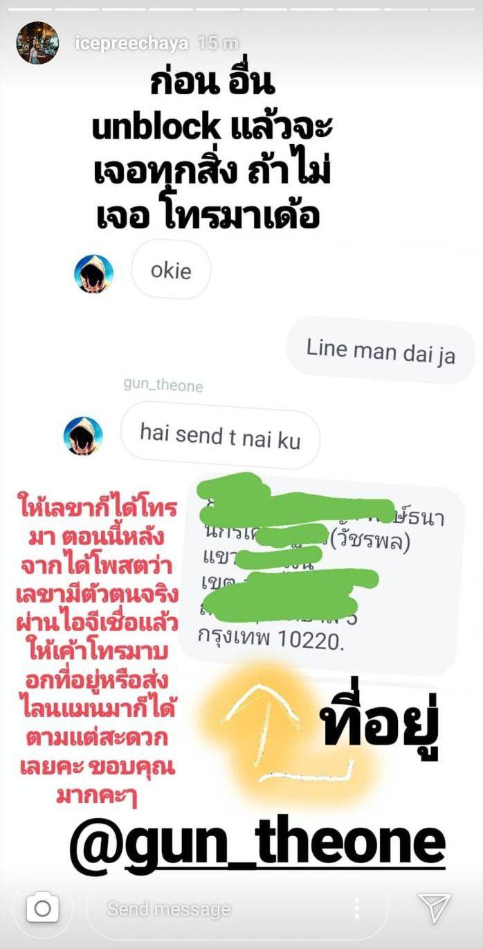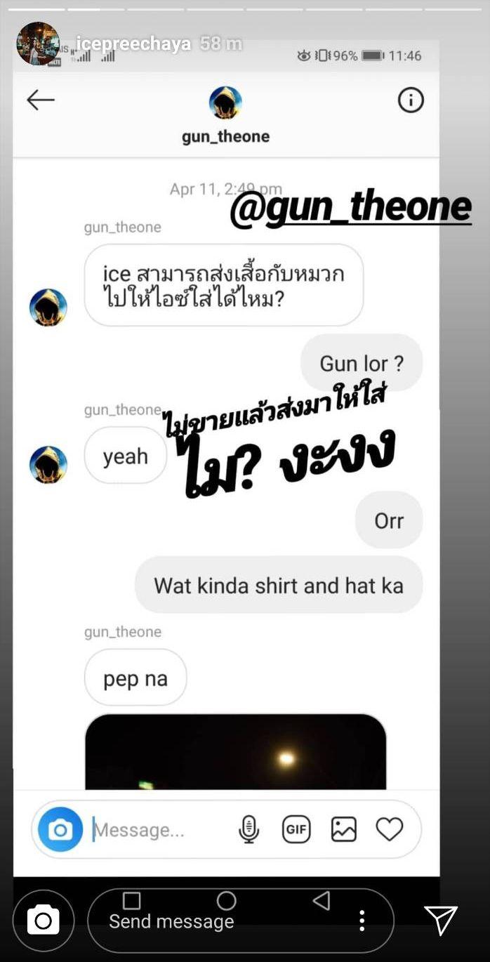 ล่าสุดสาวไอซ์ได้โพสต์ไอจีสตอรี่เป็นภาพข้อความสนทนาในไดเร็กไอจีระหว่างเจ้าตัวและไฮโซหนุ่ม โดยมีเนื้อหาว่าฝ่ายชายจะส่งเสื้อยี่ห้อหนึ่งให้โปรโมต และได้ขอทั้งที่อยู่และเบอร์โทรศัพท์รวมถึงไลน์ พร้อมทั้งพูดถึงเหตุการณ์ที่เลขาฯ ของไฮโซหนุ่มติดต่อเรื่องขอเสื้อคืน และยืนยันว่าไม่ได้บล็อกไอจีอีกฝ่าย เพราะถ้าบล็อกจะไดเร็กไอจีเข้าไปได้อย่างไร ก่อนจะบอกให้ไฮโซหนุ่มรีบมาเอาเสื้อคืน จะให้เลขาฯ โทรมาบอกที่อยู่หรือส่งทางไลน์แมนก็ได้