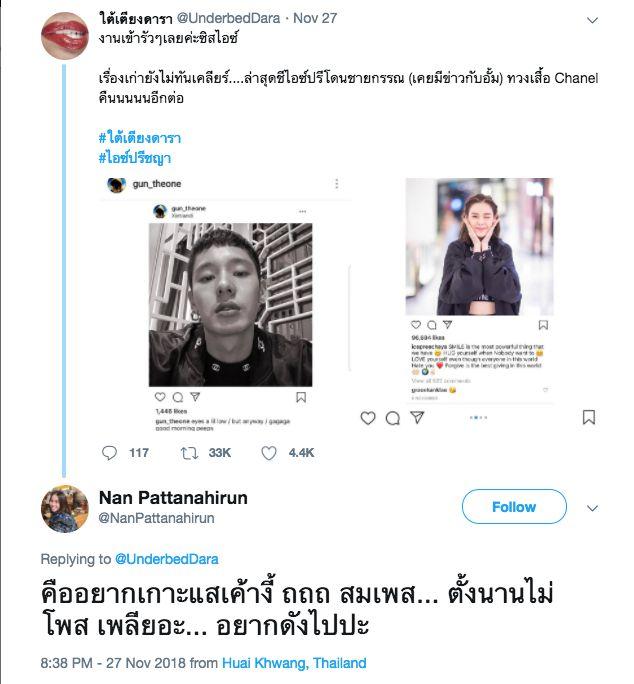 บ้างก็โยงไปถึงเรื่องที่ แนน ชุมพิชา พัฒนาหิรัญ น้องสาวนางร้าย-ผู้จัดดัง หนิง ปณิตา ธรรมวัฒนะ โพสต์ข้อความทวิตเตอร์วิจารณ์ว่าหนุ่มกรรณเกาะกระแส รวมถึงเรื่องที่หนิงเข้าไปคอมเมนต์ให้กำลังใจไอซ์ในไอจีของไอซ์ด้วย ซึ่งตอกย้ำกับข่าวที่ว่าเพื่อนในกลุ่มของซุป'ตาร์สาว อั้ม พัชราภา ไชยเชื้อ เลิกคบกับกรรณ จนทำให้กรรณต้องออกจากกลุ่มไปด้วย.