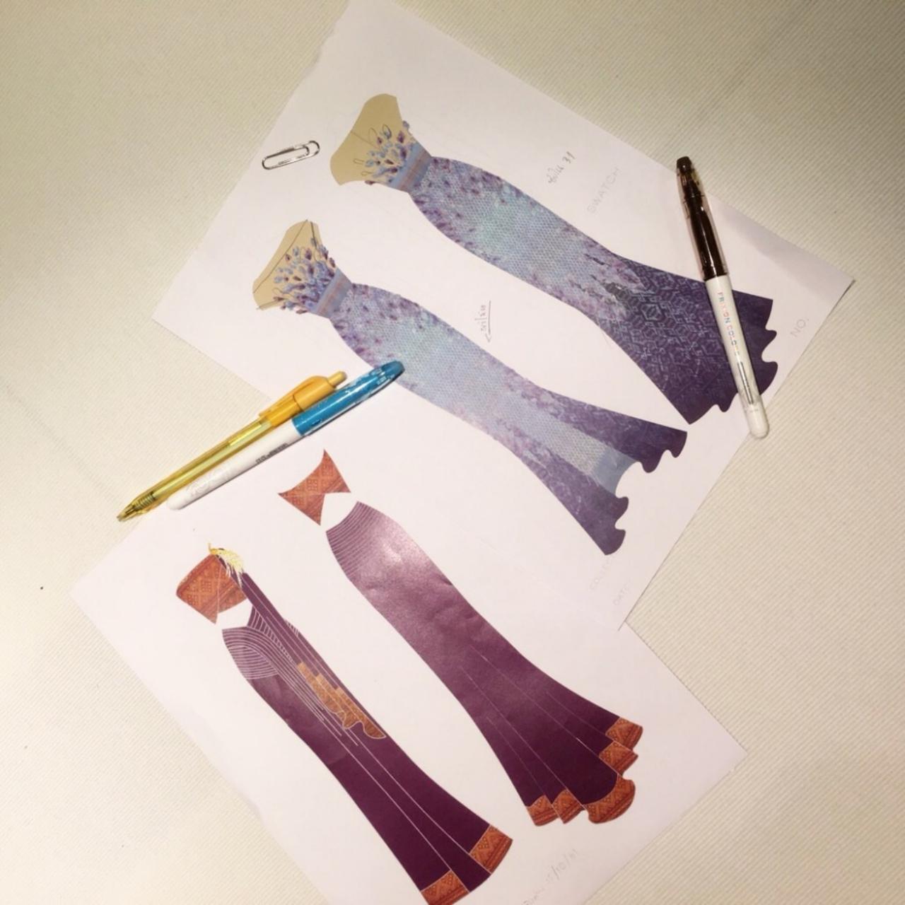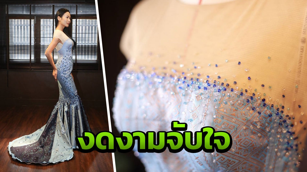 โดยเลือกใช้ผ้าไหมเรียบและผ้าไหมแพรวา ดีไซน์โดยใช้เทคนิค Draping ตกแต่งและจัดวางผ้าบนหุ่นโดยเน้นการจับผ้าให้มีความพลิ้วไหวสวยงาม และดูสวยเป็นธรรมชาติ พร้อมการปักลงบนกระโปรงแนวกรีกให้ดูทันสมัยมากขึ้น ซึ่งเป็นการผสมผสานระหว่างความเป็นไทยในชุดช่วงบนกับความเป็นสากลในชุดช่วงล่างออกมาได้อย่างลงตัว