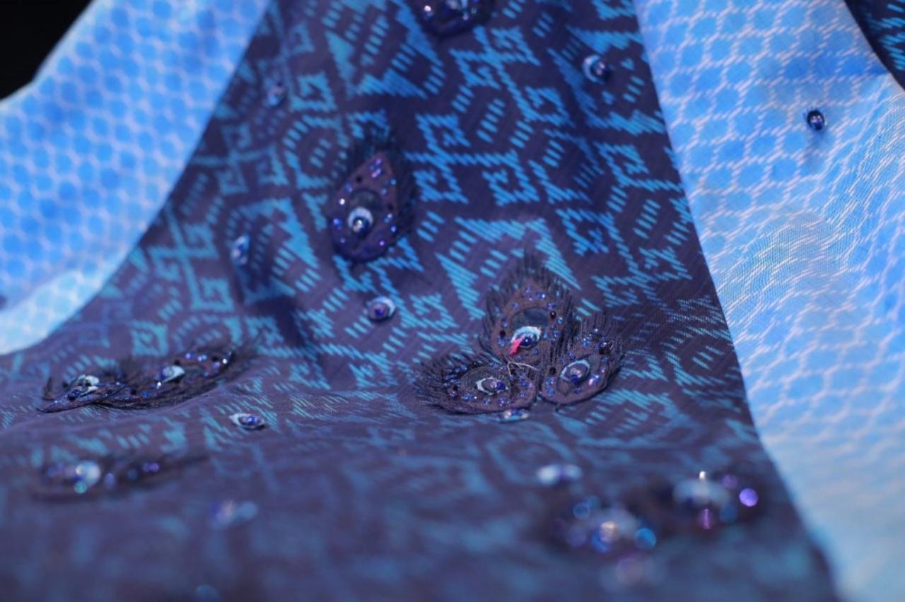 ได้ใช้เทคนิคการร้อยและปักลูกปัดแบบ Haute Couture มีการใช้ผ้าไหมมัดหมี่ และผ้าไหมแพรวามาผสมกัน ซึ่งนับเป็นอีกหนึ่งความท้าทายในการตัดเย็บผ้าไหมไทยโดยไม่ให้ความงดงามดั้งเดิมสูญเสียไป ทุกพื้นที่บนผืนผ้าของชุดยังได้ถ่ายทอดความเป็น “นกยูง” ซึ่งเป็นตราสัญลักษณ์ประจำแบรนด์ SIRIVANNAVARI