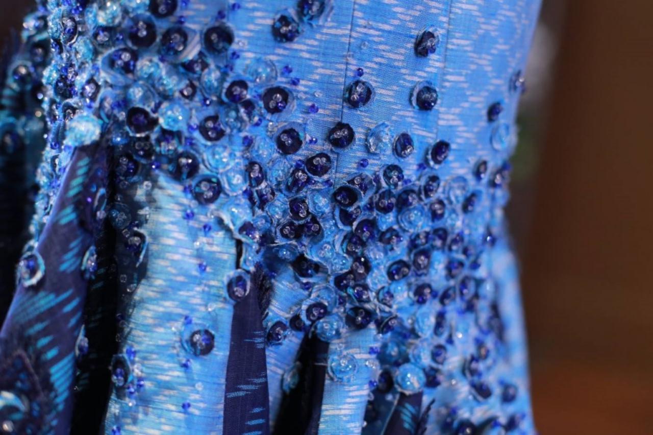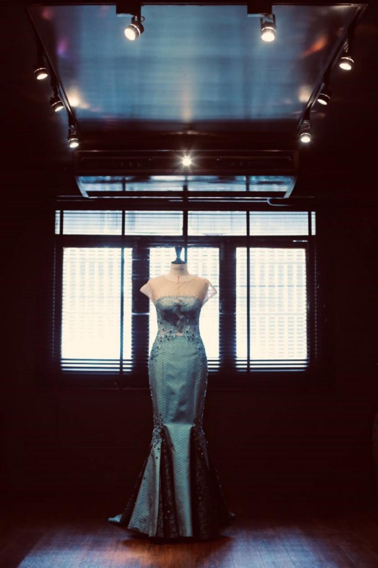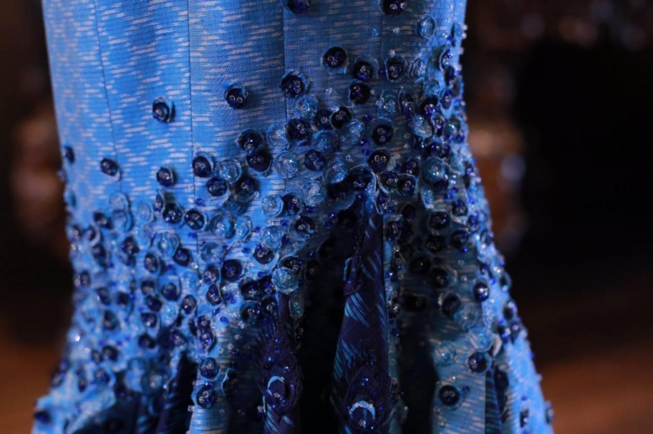 ที่เปรียบให้เห็นว่า นกยูงเป็นสัตว์ที่สะท้อนถึงความสง่างามและความอ่อนโยนในแบบผู้หญิงที่มีความสวยงาม และโดดเด่นในรูปแบบของตัวเอง สังเกตได้จากกระดุม 19 เม็ด ที่ประดับเรียงเป็นแถวบริเวณด้านหลังชุด โดยประทับตราสัญลักษณ์แบรนด์ทุกเม็ดกระดุม หรือชายกระโปรงลากยาวได้ออกแบบเสมือนปีกนกยูงที่กำลังรอรำแพน มีดอกดวงหรือแววมยุราที่เล่นดีเทลด้วยการตัดเย็บผ้าสีฟ้า สีน้ำเงินอยู่ในพื้นที่วงกลม ล้อมรอบด้วยเส้นไหมให้ดูราวขนปีกนกยูง ซึ่งนับเป็นผลงานที่รังสรรค์ทุกรายละเอียดด้วยความประณีตอย่างสูง