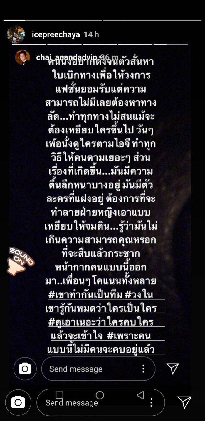 โดย ชาย ได้โพสต์ภาพข้อความในไอจีสตอรี่ว่า “คนนึงอยากดังจนตัวสั่น หาใบเบิกทางเพื่อให้วงการแฟชั่นยอมรับ แต่ความสามารถไม่มีเลยต้องหาทางลัด... ทำทุกทางไม่สนแม้จะต้องเหยียบใครขึ้นไป วันๆ เพ้อนั่งดูใครตามไอจี ทำทุกวิธีให้คนตามเยอะๆ