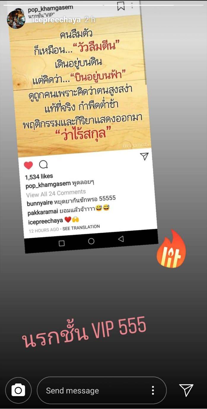 งานนี้ก็ไม่รู้ว่าใครกันที่ทำให้ไฮโซหนุ่มเดือดถึงขั้นโพสต์แบบนี้ แต่ที่แน่ๆ คงจะถูกใจนางเอกสาวหน้าใส ไอซ์ ปรีชญา พงษ์ธนานิกร เอามากๆ ถึงขั้นรีโพสต์ข้อความของชายลงไอจีสตอรี่ของตัวเอง อีกทั้งรีโพสต์ภาพข้อความในไอจีของนักแสดง-พิธีกรหนุ่ม ป๊อป คำเกษม หนึ่งในเพื่อนสนิทแก๊งสาวอั้ม พัชราภา และเขียนแคปชั่น "นรกชั้น VIP 555" ในไอจีสตอรี่ด้วย.
