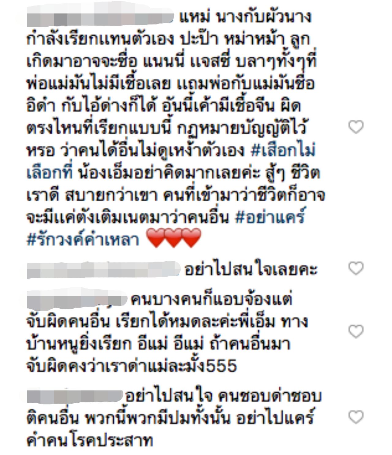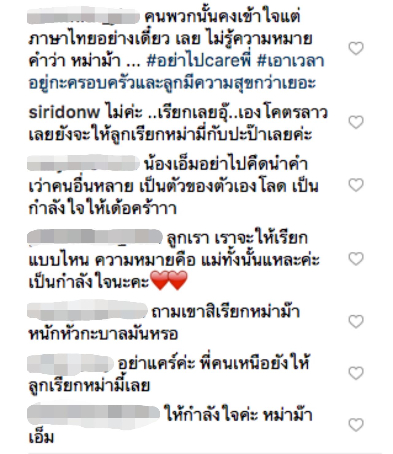 ซึ่งหลังจากที่ เอ็ม ได้โพสต์เรื่องนี้ลงอินสตาแกรม หลายคนก็ได้เข้ามาให้กำลังใจ พร้อมกับบอกว่า จะเรียกอะไรความหมายก็คือคำว่า แม่ เหมือนกัน จะเรียกอะไรมันก็สิทธิ์ของเค้า อย่าได้ไปแคร์อะไรกับคนพวกนี้...