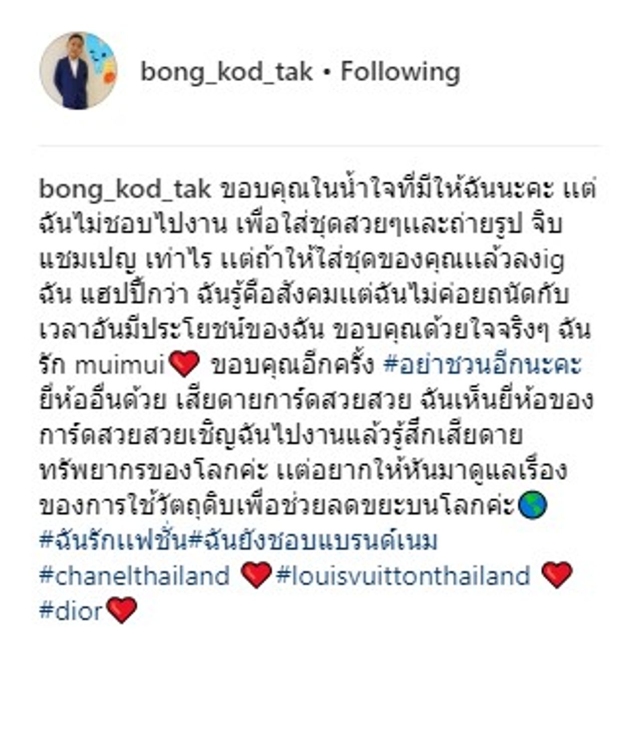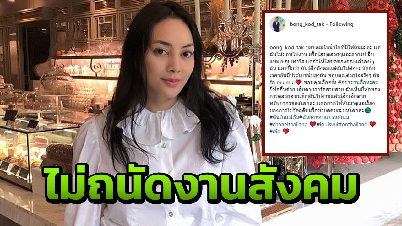 โดย ตั๊ก ได้โพสต์ข้อความชี้แจงเหตุผลไว้ในไอจีส่วนตัว หลังจากที่ได้รับการ์ดเชิญจากแบรนด์เนมดังยี่ห้อหนึ่งว่า “ขอบคุณในน้ำใจที่มีให้ฉันนะคะ แต่ฉันไม่ชอบไปงาน เพื่อใส่ชุดสวยๆ และถ่ายรูป จิบแชมเปญเท่าไร แต่ถ้าให้ใส่ชุดของคุณแล้วลง ig ฉันแฮปปี้กว่า ฉันรู้คือสังคมแต่ฉันไม่ค่อยถนัดกับเวลาอันมีประโยชน์ของฉัน ขอบคุณด้วยใจจริงๆ ฉันรัก Miu Miu ขอบคุณอีกครั้ง #อย่าชวนอีกนะคะ