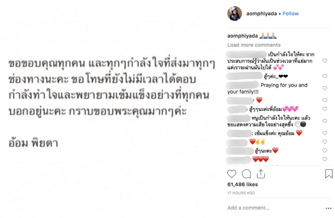 "ขอขอบคุณทุกคน และทุกกำลังใจที่ส่งมาทุกๆ ช่องทางนะคะ ขอโทษที่ยังไม่มีเวลาได้ตอบ กำลังทำใจและพยายามเข้มแข็งอย่างที่ทุกคนบอกอยู่นะคะ กราบขอบพระคุณมากๆ ค่ะ"
