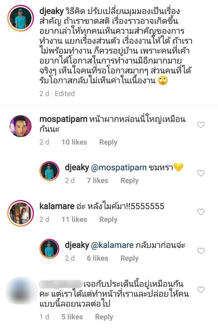งานนี้เลยมีแฟนๆ เข้ามาแสดงความคิดเห็นกันเพียบ รวมไปถึงพิธีกร-ผู้ประกาศข่าวสาว กาละแมร์ พัชรศรี เบญจมาศ ที่อยากรู้ถึงขั้นบอกว่า “อ่ะ หลังไมค์มา!!5555555” และดีเจเอกกี้ตอบกลับว่า “กลับมาก่อนจ่ะ” ส่วนนักร้องนักแสดงหนุ่ม มอส ปฏิภาณ ปฐวีกานต์ ดูจะไม่ได้สนใจแคปชั่น แต่สนใจภาพของดีเจเอกกี้และแซวว่า “หน้าผากหล่อนนี่ใหญ่เหมือนกันนะ” และดีเจเอกกี้ตอบกลับว่า “ชมหรา”