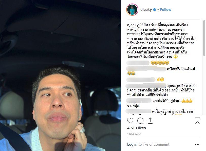 ล่าสุดดีเจเอกกี้ได้โพสต์ข้อความแซ่บๆ อีกแล้ว โดยเจ้าตัวได้โพสต์ภาพตัวเองมีสีหน้าเซ็งๆ เบื่อๆ และเขียนข้อความว่า “วิธีคิด ปรับเปลี่ยนมุมมองเป็นเรื่องสำคัญ ถ้าเราขาดสติ เรื่องราวอาจเกิดขึ้น อยากเล่าให้ทุกคนเห็นความสำคัญของการทำงาน แยกเรื่องส่วนตัว เรื่องงานให้ได้ ถ้าเราไม่พร้อมทำงาน ก็ควรอยู่บ้าน เพราะคนที่เค้าอยากได้โอกาสในการทำงานมีอีกมากมายจริงๆ เห็นใจคนที่รอโอกาสมากๆ ส่วนคนที่ได้รับโอกาสกลับไม่เห็นค่าในเนื้องาน” พร้อมทั้งใส่อีโมติคอนมองบนด้วย