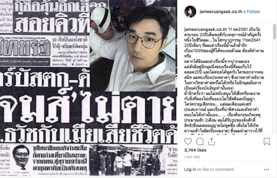 ก่อนหน้านี้นักร้องนักแสดงหนุ่มตี๋ เจมส์ เรืองศักดิ์ ลอยชูศักดิ์ ได้โพสต์เล่าประสบการณ์ขนหัวลุก 2 เดือนก่อนเจอเหตุการณ์เครื่องบินตกเมื่อ 20 ปีที่แล้ว โดยเจ้าตัวได้พูดถึงรูปศักดิ์สิทธิ์รูปหนึ่งที่ได้รับมาและทำให้เจ้าตัวเจอเหตุการณ์ขนหัวลุกดังกล่าว รวมไปถึงเสียงปริศนาที่ปลุกให้เจ้าตัวตื่นหลังประสบอุบัติเหตุเครื่องบินตกด้วย จนกลายเป็นเรื่องที่หลายคนให้ความสนใจอย่างมาก