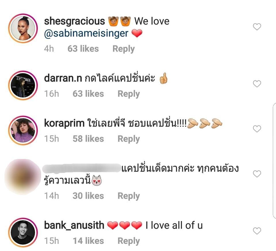 งานนี้บรรดาสาวๆ เดอะเฟซต่างก็ให้กำลังใจซาบีน่าใต้ภาพของจีน่ากันเพียบ อาทิ เกรซ เดอะเฟซ 3, ดารัณ เดอะเฟซ 3, ปริม เดอะเฟซ 3 ฯลฯ รวมไปถึงแฟนๆ อีกหลายคนที่เข้ามาให้กำลังใจเช่นกัน ด้านเทียหลังจากที่จีน่าโพสต์ภาพและข้อความดังกล่าวก็ขึ้นไอจีสตอรี่เป็นรูปแมวอ้าปากแล้วเขียนข้อความว่า “*we’re not even close*” ซึ่งแปลความได้ประมาณว่า “เราไม่เคยสนิทกันนะ” ก่อนที่จะลบภาพไอจีสตอรี่ออกไป และในไอจีของเทียก็มีคนเข้ามาคอมเมนต์วิจารณ์อย่างหนัก แต่ก็มีแฟนๆ เข้ามาให้กำลังใจเช่นกัน